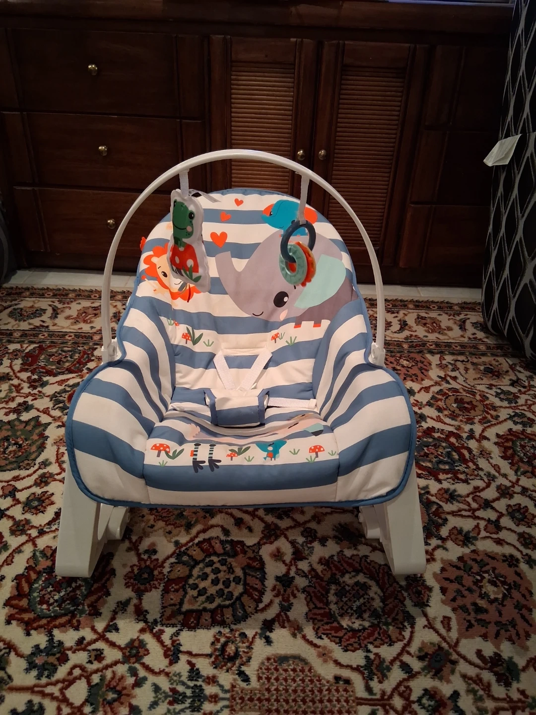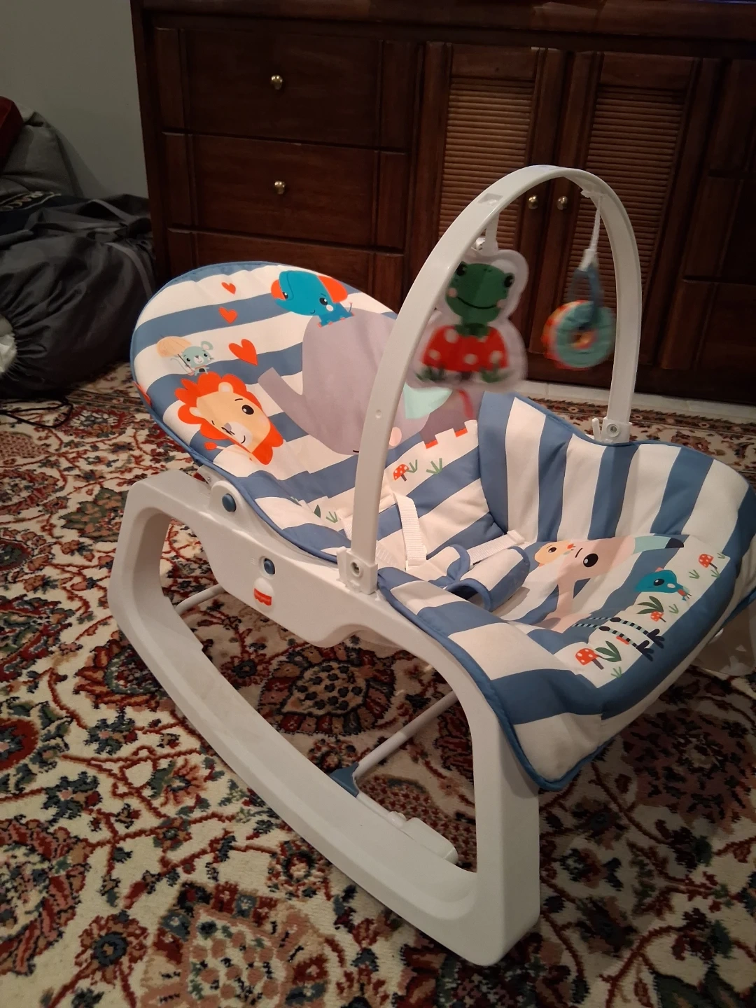 This Fisher-Price baby rocker chair features a playful animal and stripe design. It has a secure harness for safety. It's suitable for soothing infants.