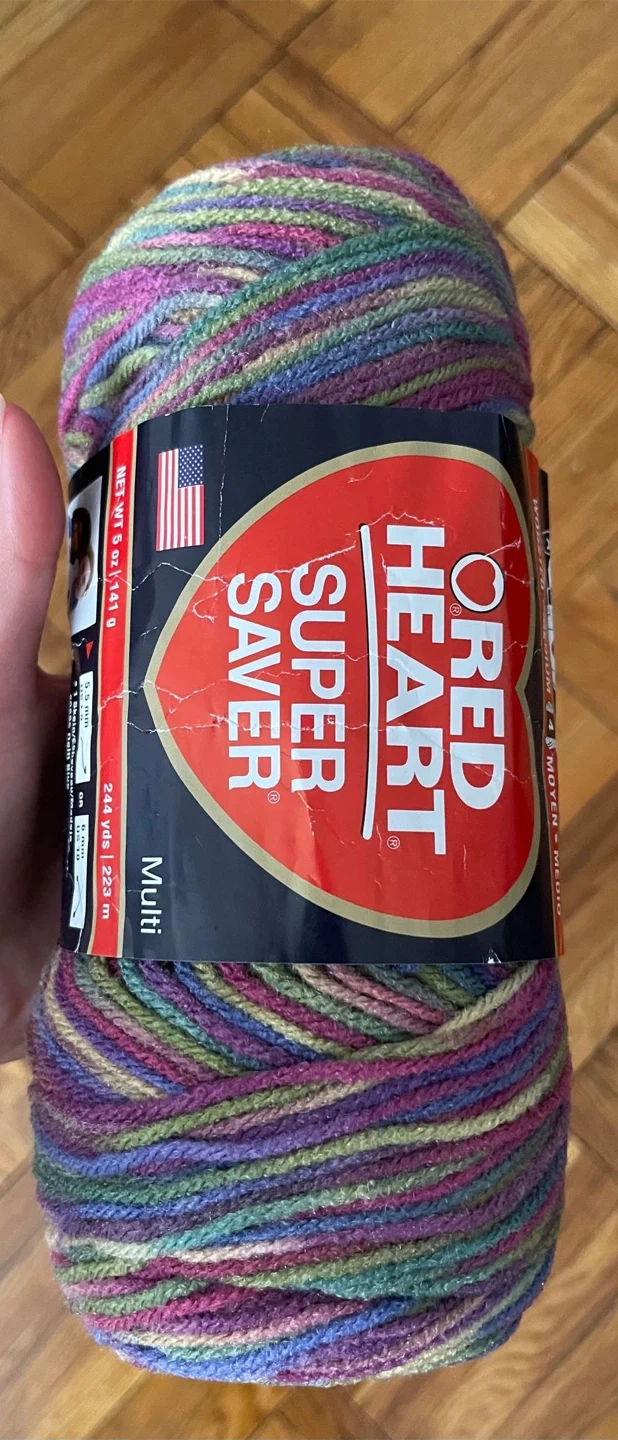 This is a skein of Red Heart Super Saver yarn in a multi-colourway. It's made from 100% acrylic. This yarn is 3.0 oz (141g) and has 243 yards (223 m).