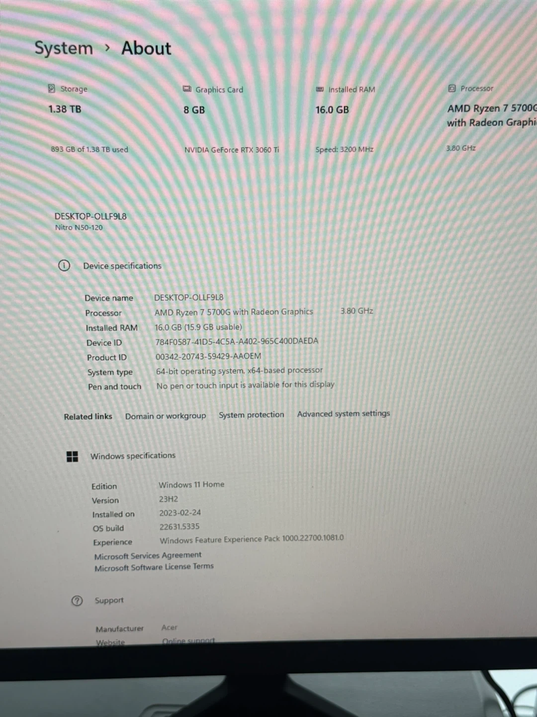 Acer Nitro N50-120 desktop computer. It's powered by an AMD Ryzen 7 5700G processor with Radeon Graphics. This PC has 16GB of RAM and a 1.38TB storage drive. It runs Windows 11 Home and has a NVIDIA GeForce RTX 3060 Ti graphics card.