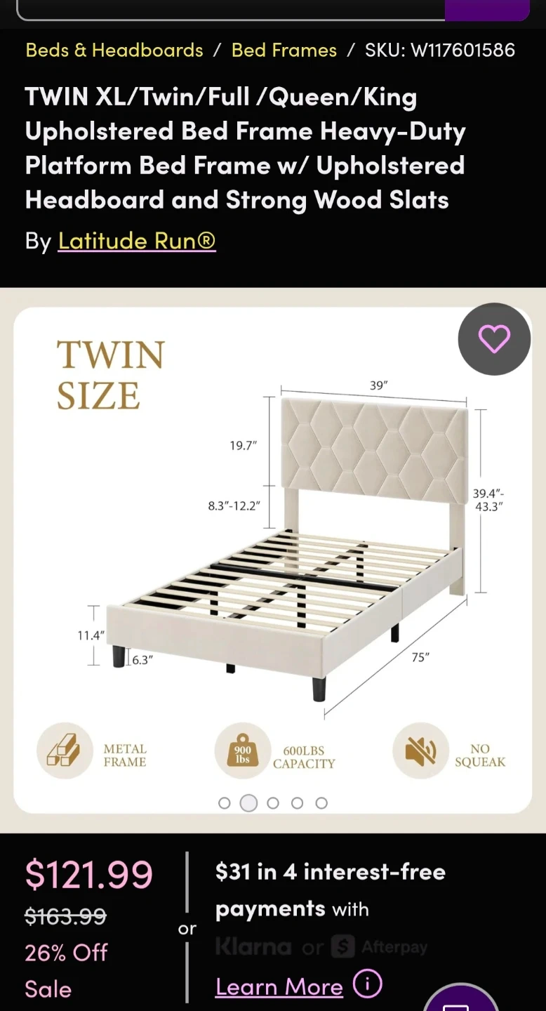 Selling a brand new GARVEE Twin XL bed frame! It's still in the original box and ready for easy assembly. This platform bed frame features an upholstered headboard and strong wood slats. Originally purchased for $121.99. Get a great deal on a comfortable and stylish bed!