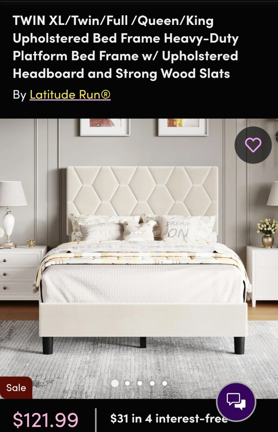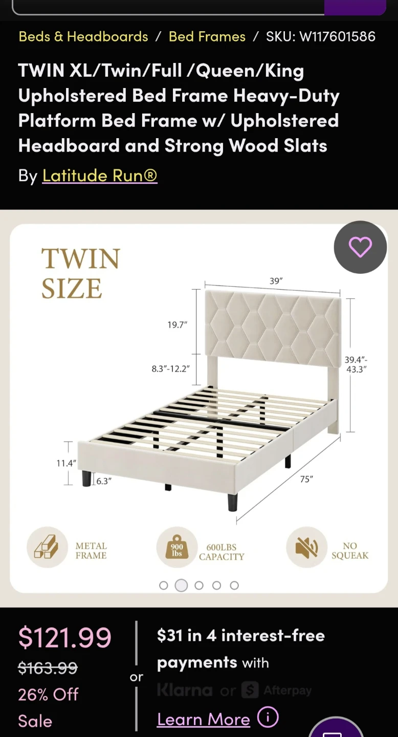 Selling a brand new GARVEE Twin XL bed frame! It's still in the original box and ready for easy assembly. This platform bed frame features an upholstered headboard and strong wood slats. Originally purchased for $121.99. Get a great deal on a comfortable and stylish bed!