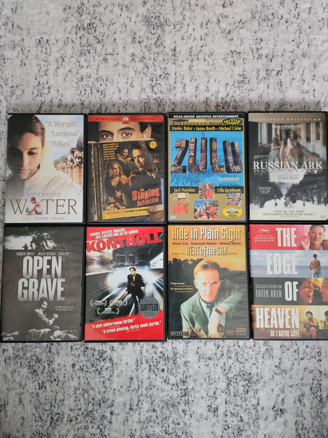 Collection of 8 DVDs including 'Water', 'The Singing Detective', 'Zulu', 'Russian Ark', 'Open Grave', 'Kontroll', 'Hide in Plain Sight', and 'The Edge of Heaven'. These discs are ready for viewing. $1 each