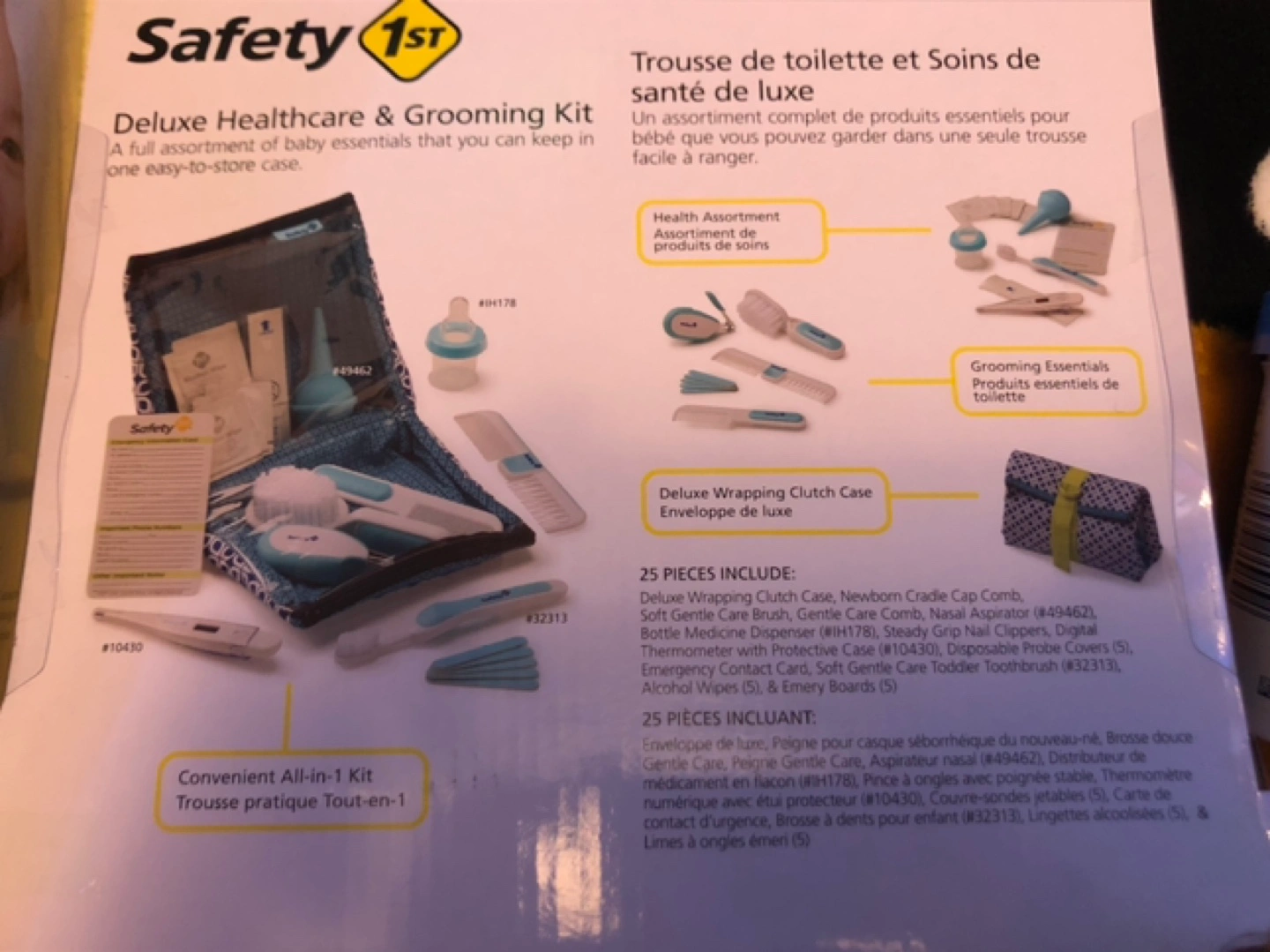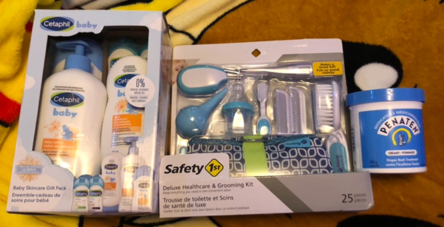 Newborn essentials bundle. Includes Cetaphil Baby skincare gift pack with wash, lotion and massage oil. Also features Safety 1st deluxe healthcare & grooming kit (25 pieces) and Penaten diaper rash cream. Perfect for new parents!