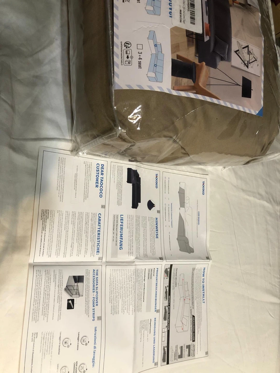 These are new TAOCOCO sectional couch covers in taupe. They're made of a soft fabric. Includes foam pieces for tucking. Pick up at Islington /401 / bergamot avenue Etobicoke.
