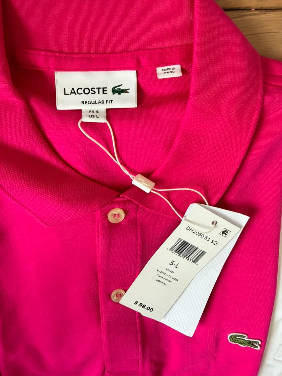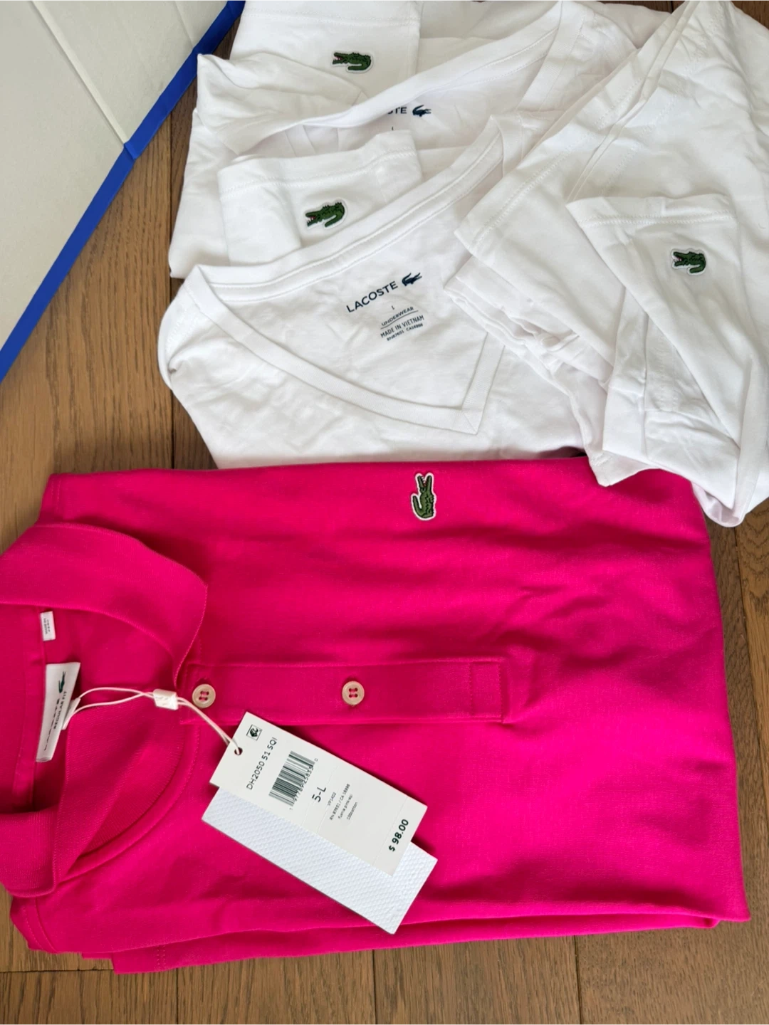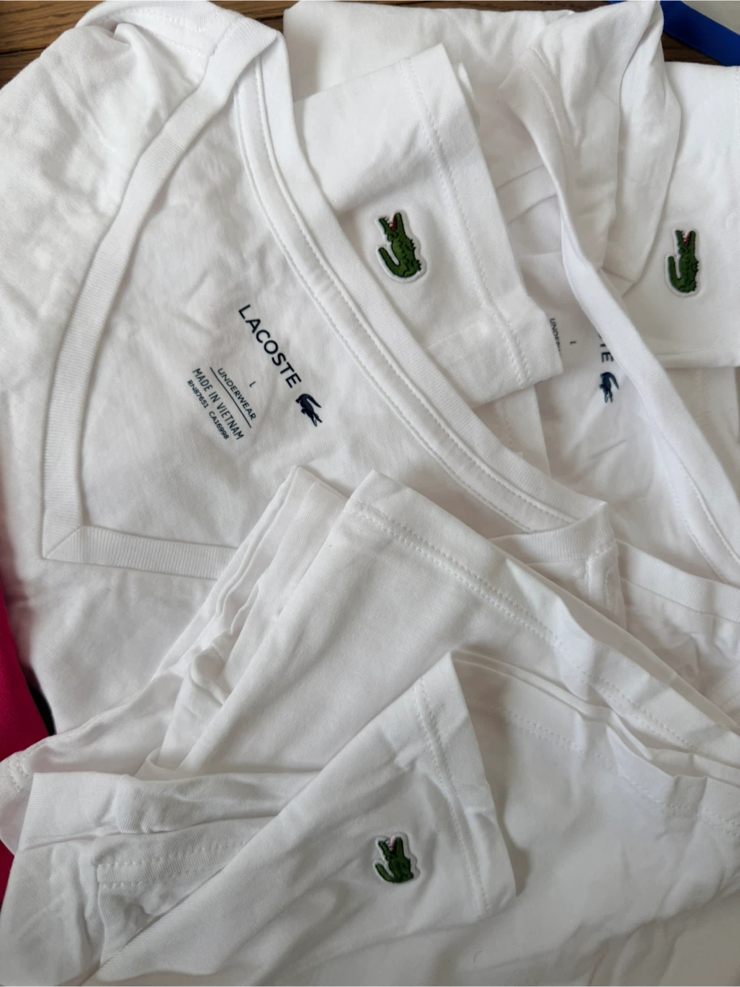 Bundle of Lacoste shirts includes three white V-neck t-shirts and one pink polo shirt. All shirts are size L. The polo shirt is regular fit and made of 100% cotton. The white t-shirts are made in Vietnam and marked as underwear.
