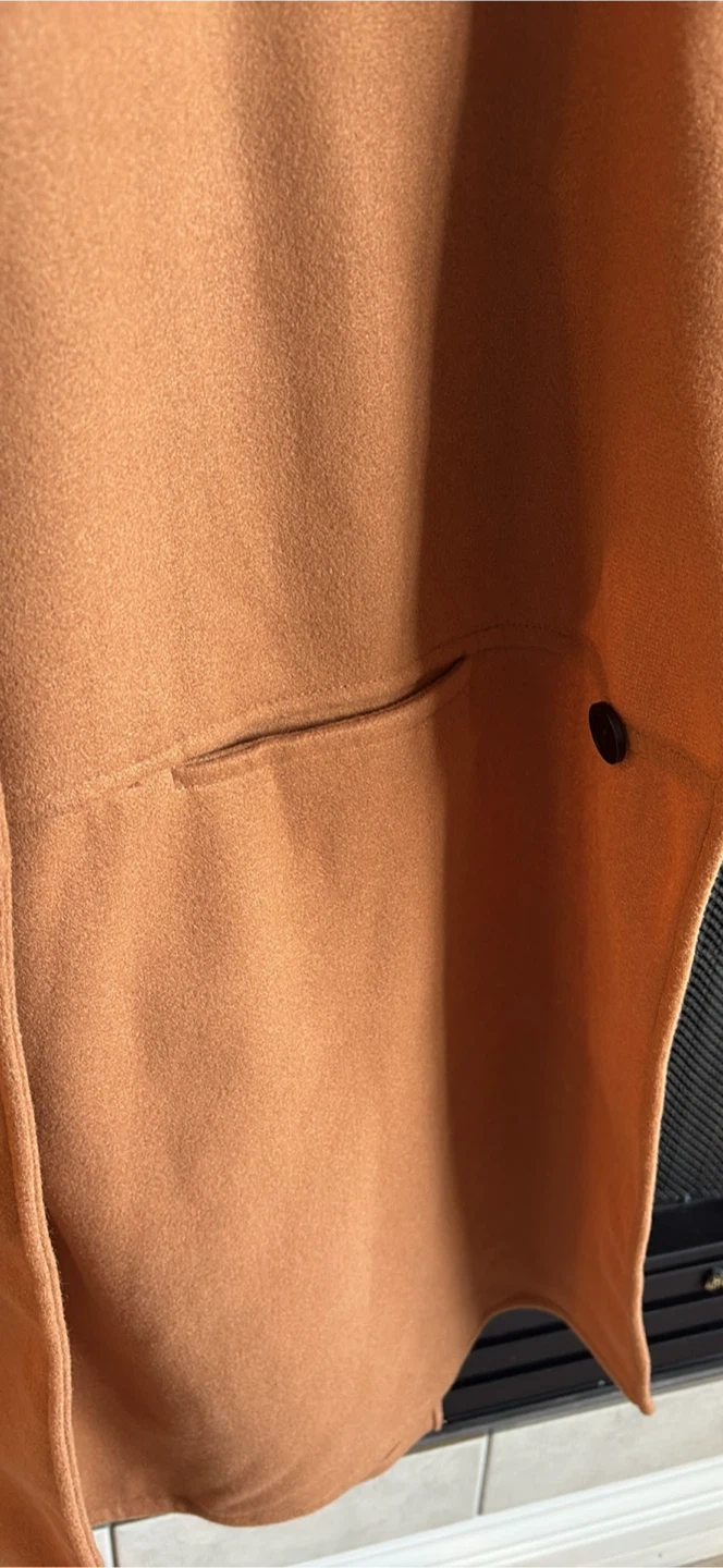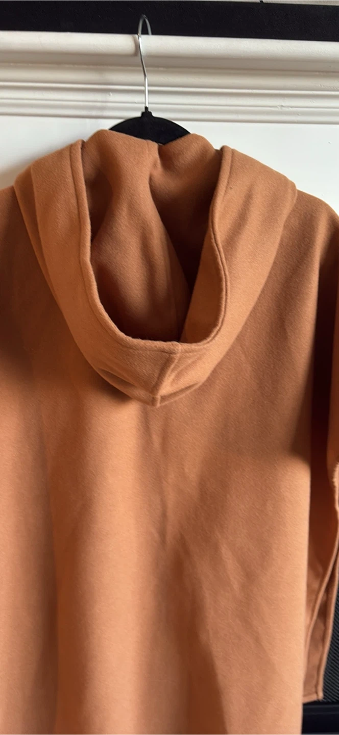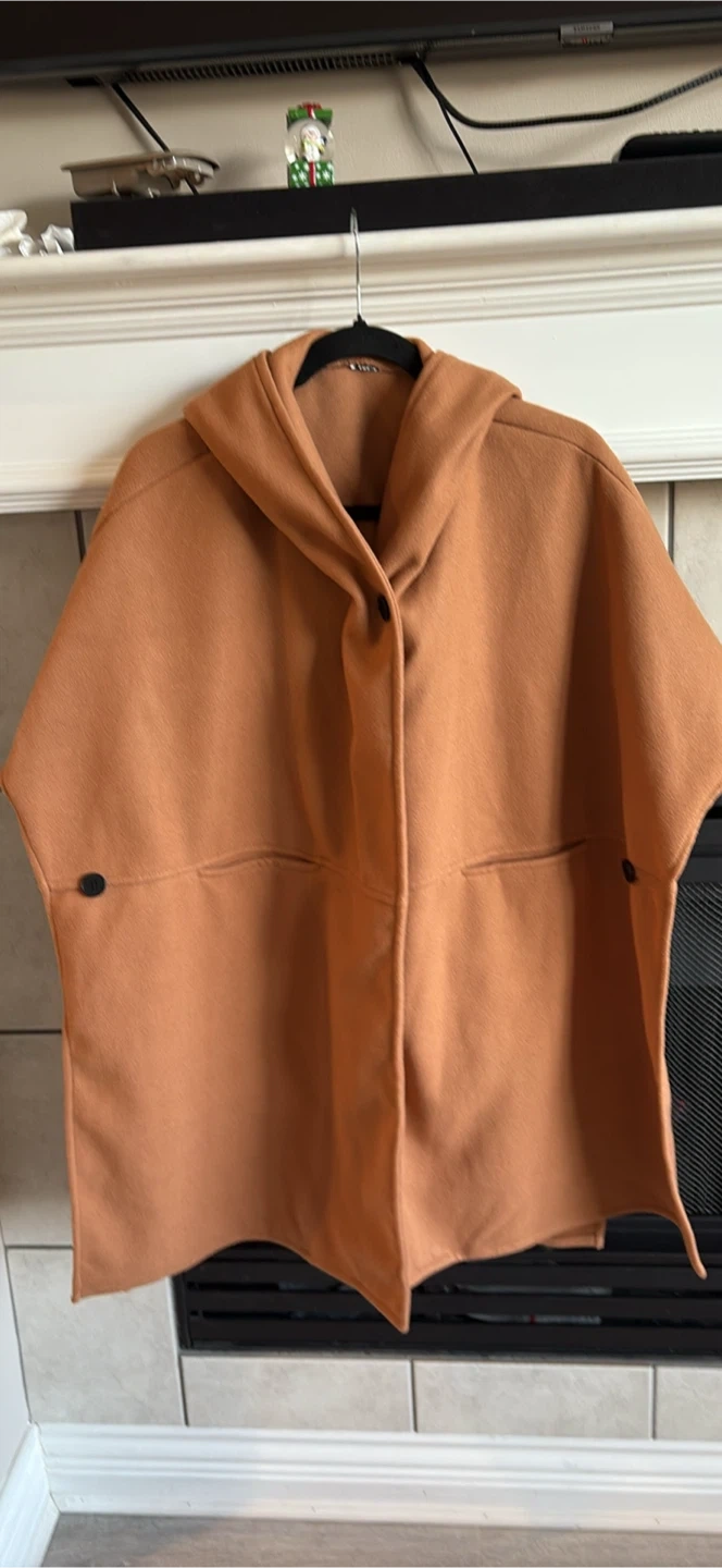Selling a cozy brown hooded poncho! It's in great condition and perfect for layering during cooler weather. It features a hood and button details