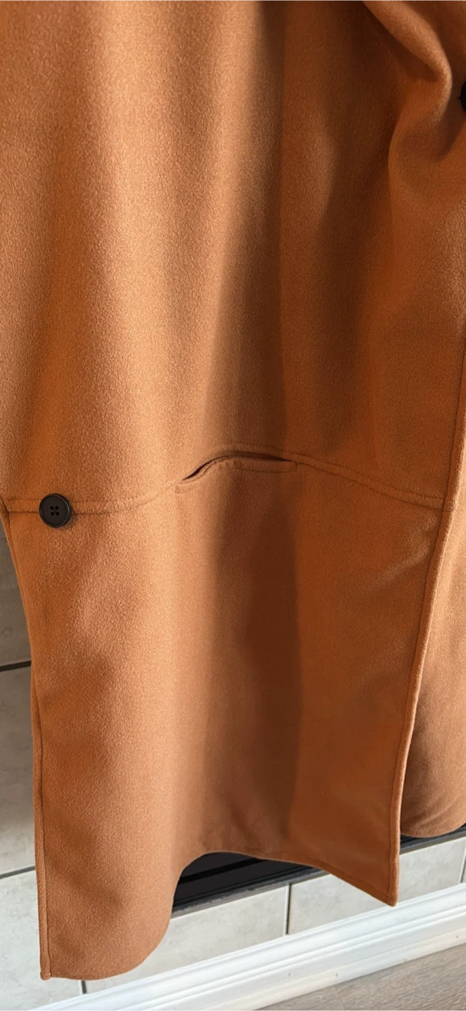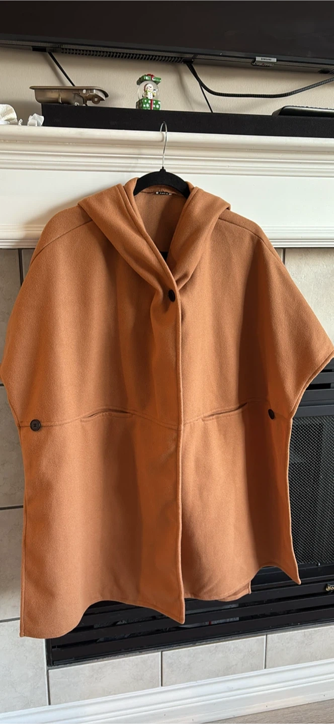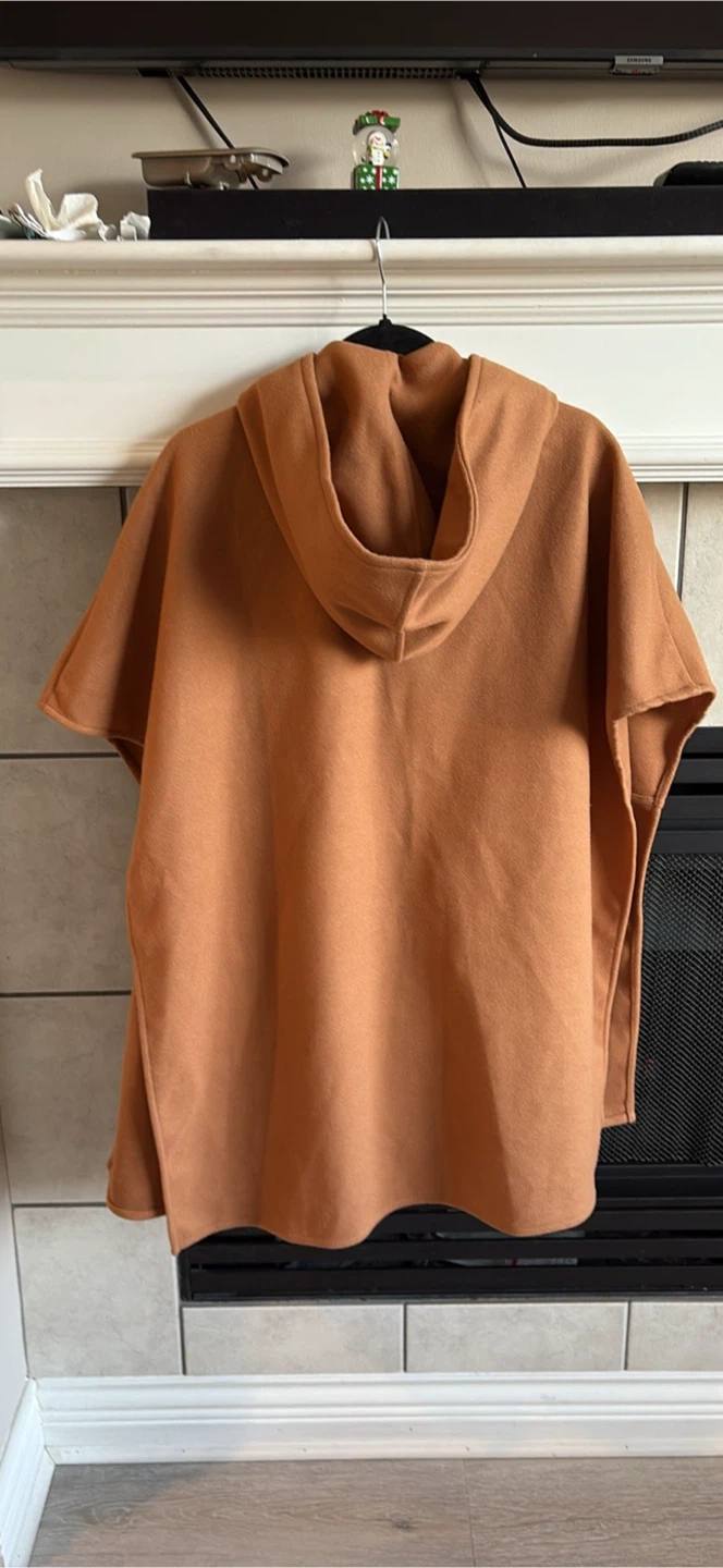 Selling a cozy brown hooded poncho! It's in great condition and perfect for layering during cooler weather. It features a hood and button details