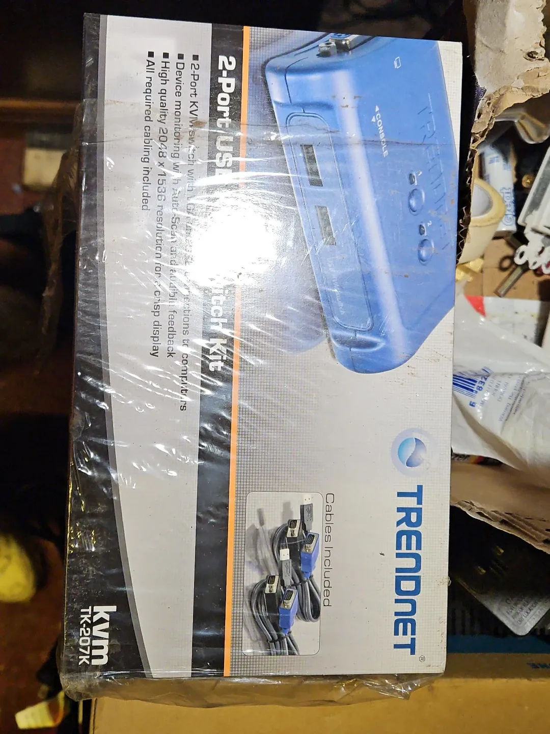 This is a TRENDnet 2-Port USB KVM Switch Kit, model TK-207K. It supports 2-Port KVM with VGA and USB connections to computers. Device monitoring with Auto-Scan and audible feedback is included, offering high quality 2048 x 1536 resolution for a crisp display. All required cabling is included.