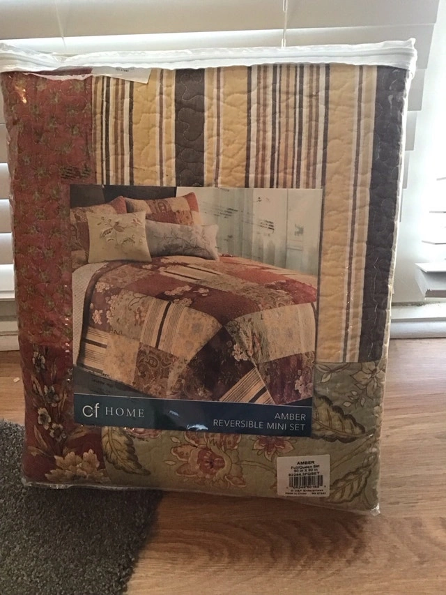 Brand new in packaging, never used, two-in-one reversible queen size quilt, 90" x 90", with two pillow shams. Pickup Kanata near Moodie Dr & Queensway. No delivery.