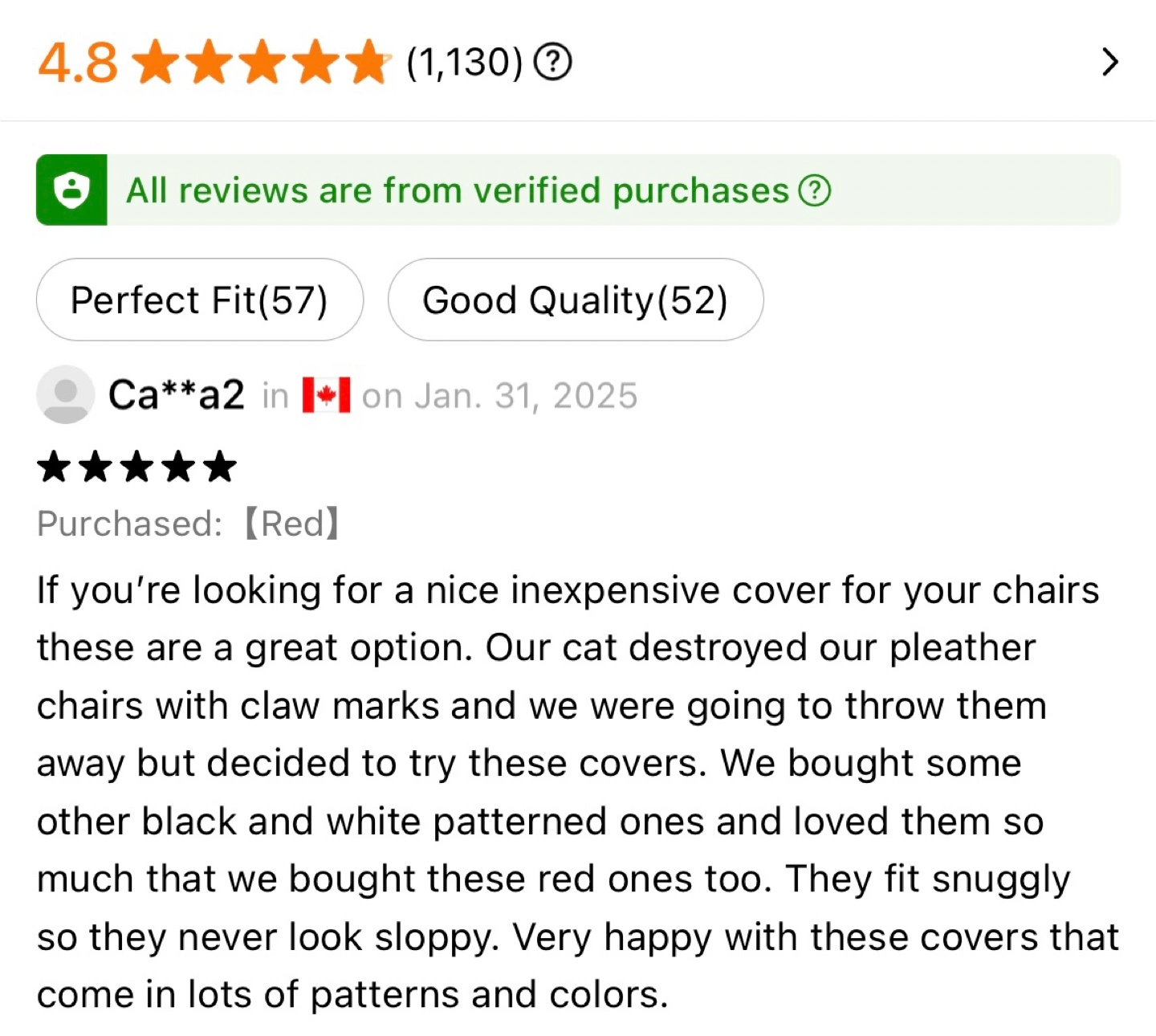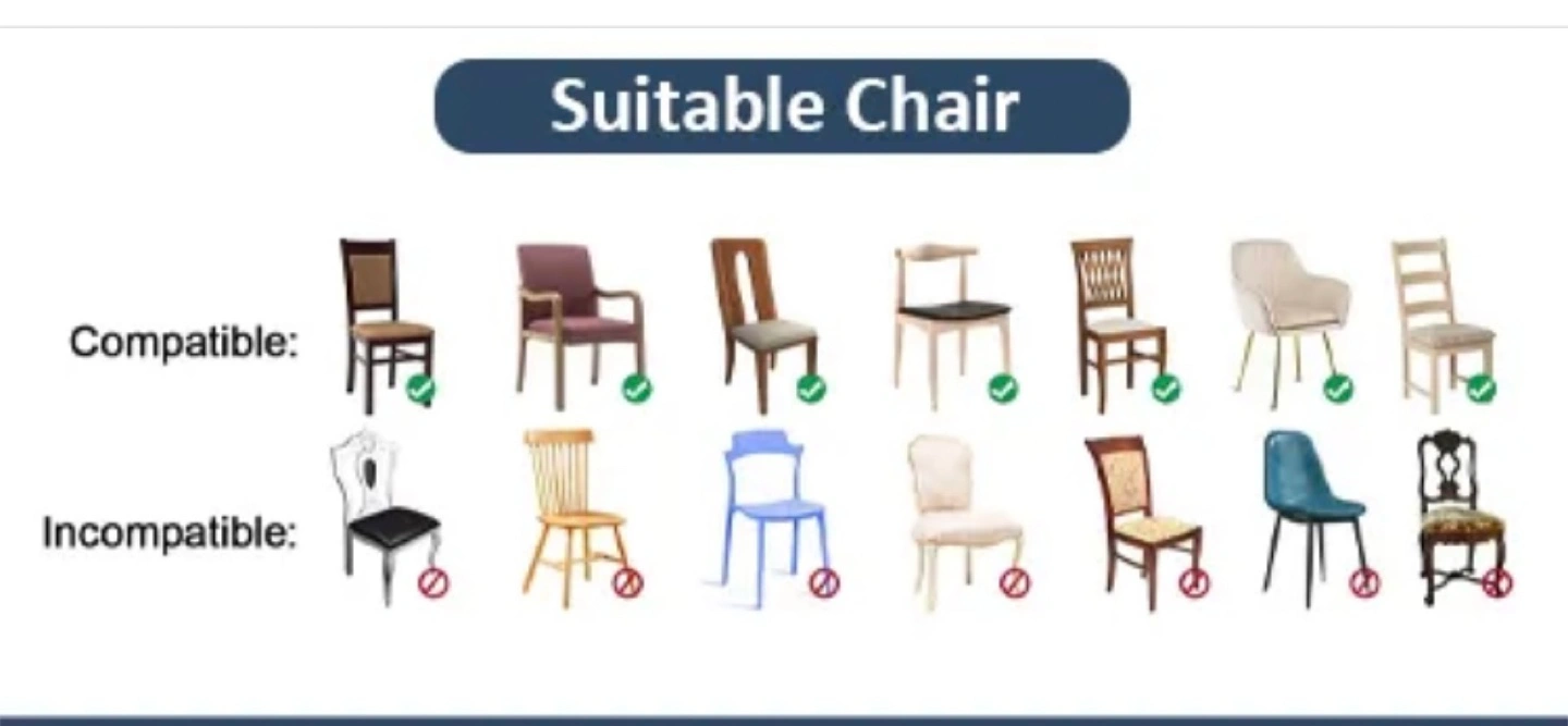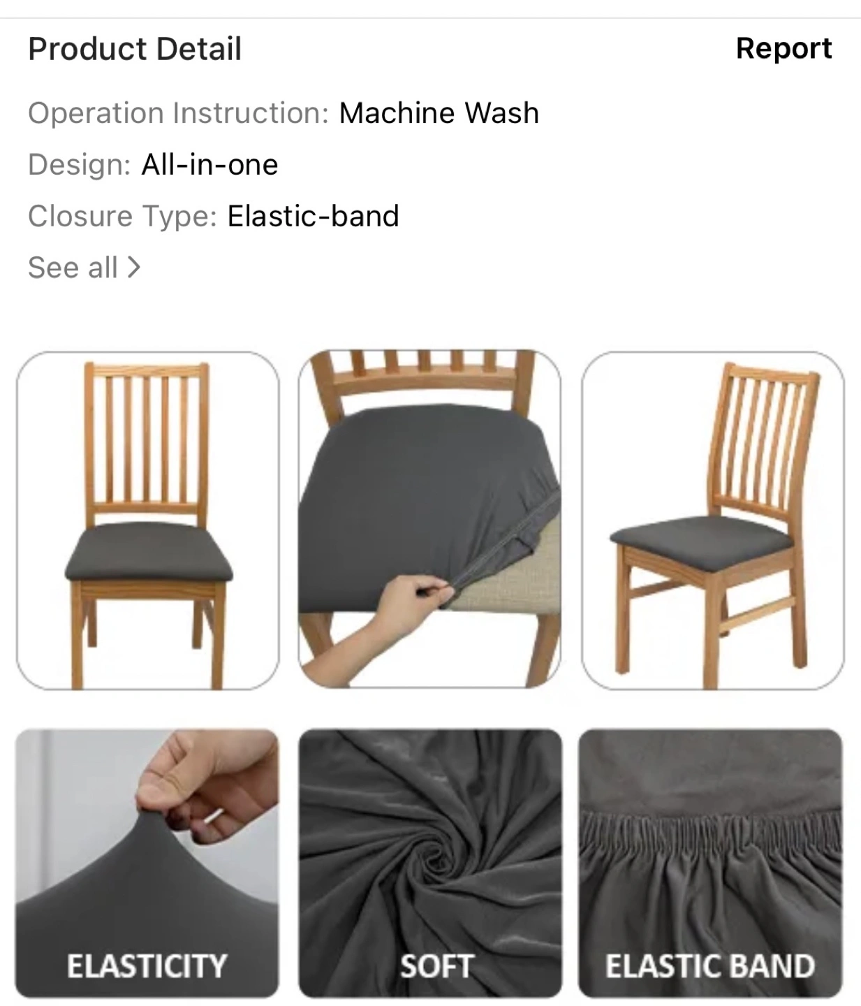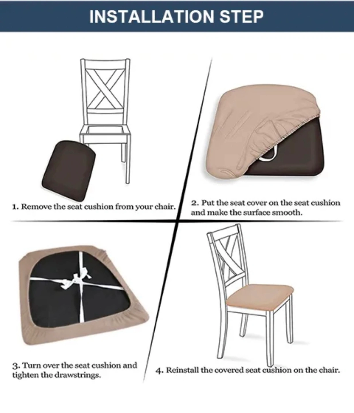 Set of six black chair covers. Soft, comfortable, and breathable. High elasticity, repeated stretching maintains shape. Machine washable, no bleach, no ironing.