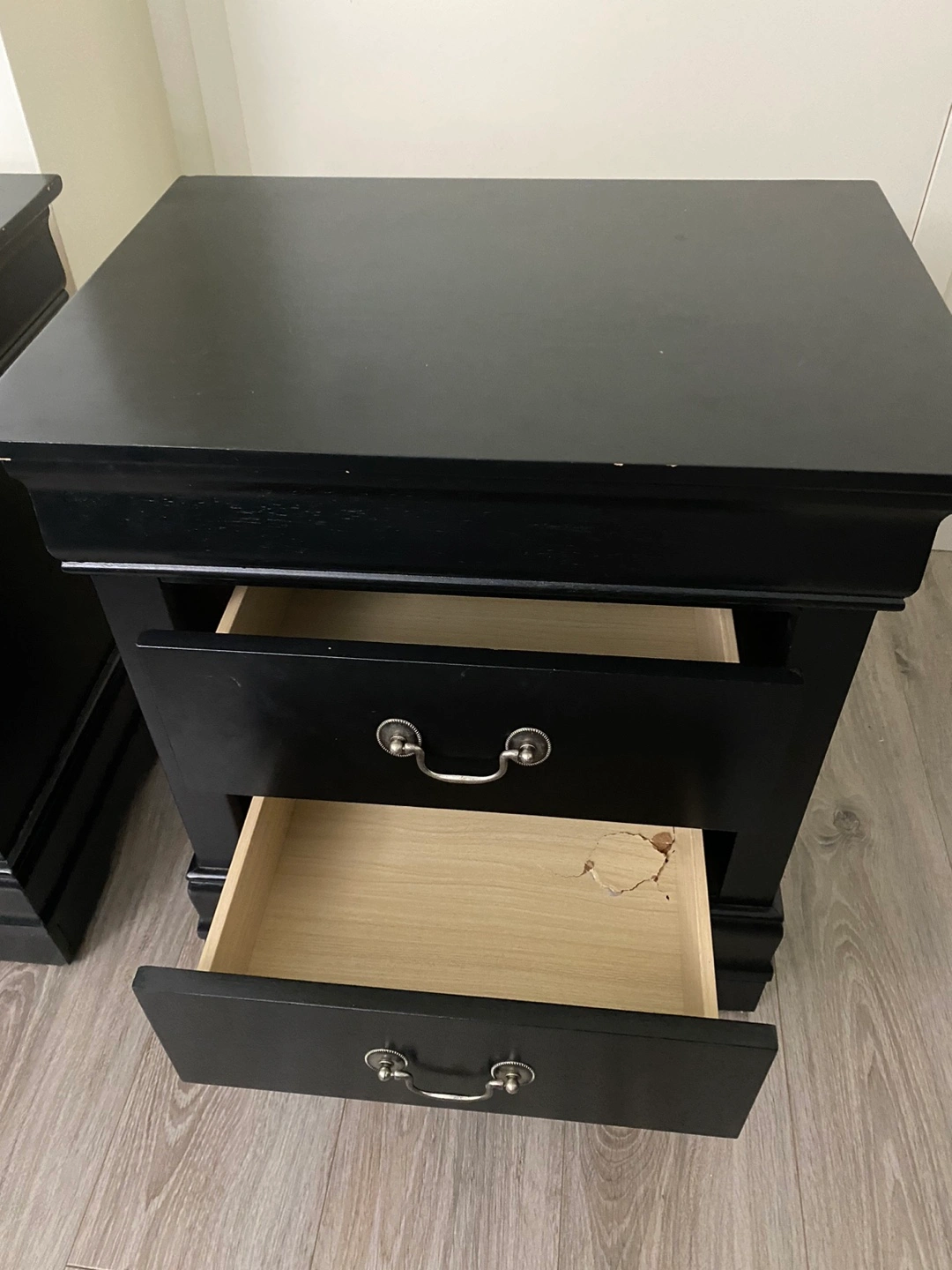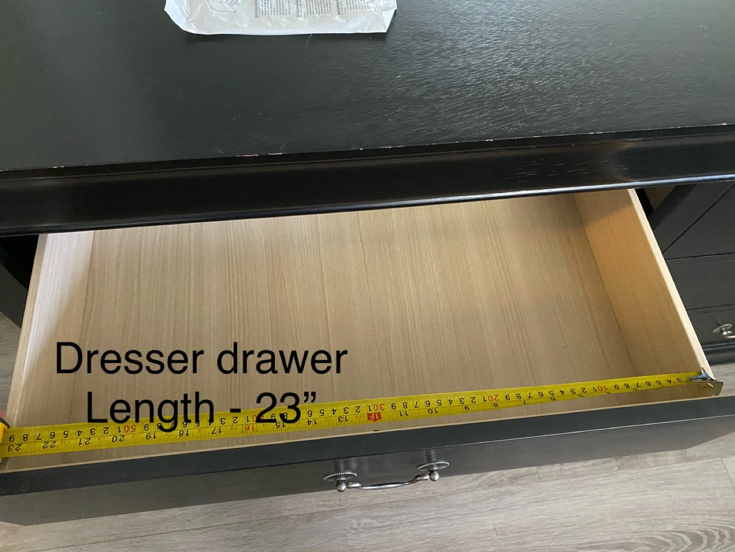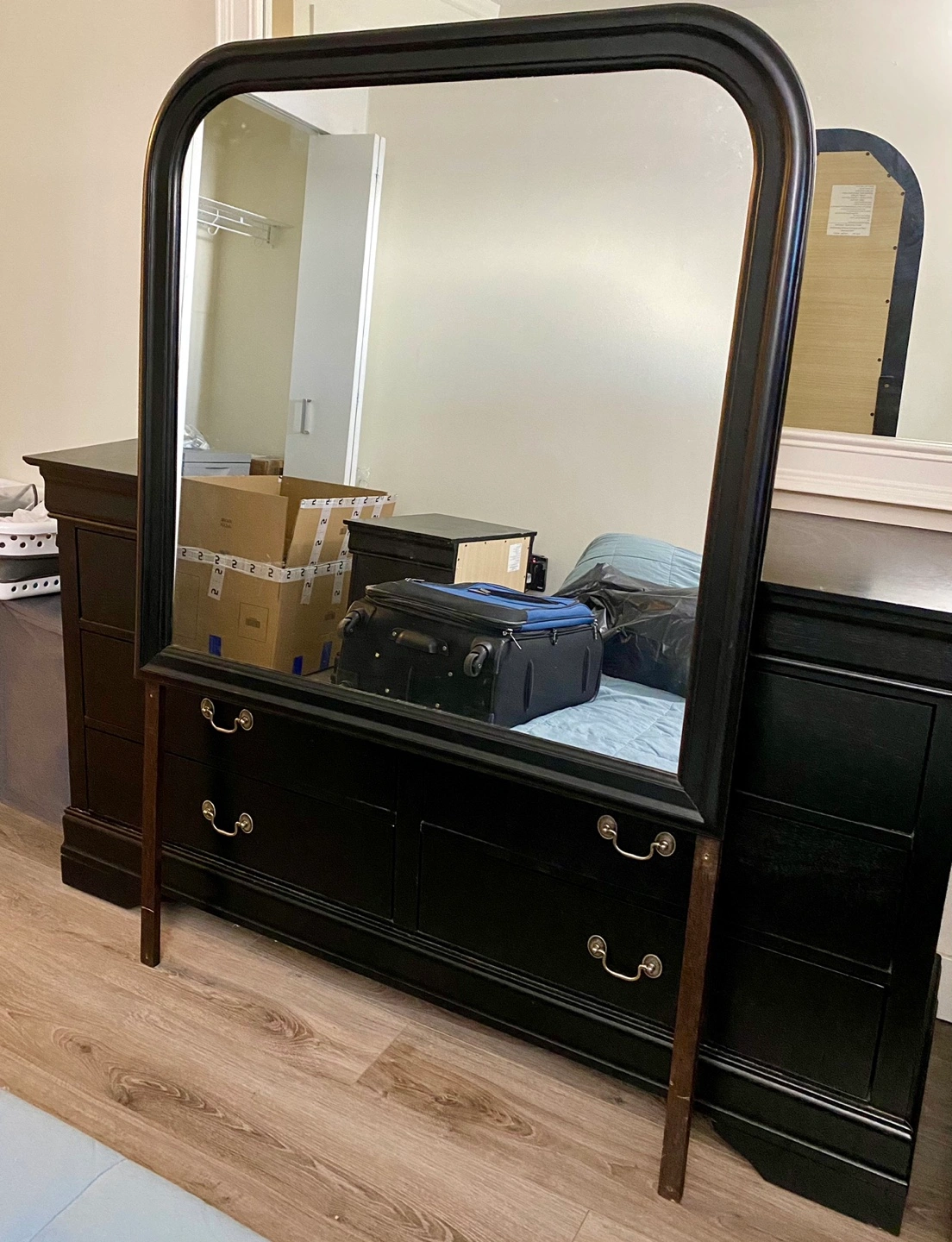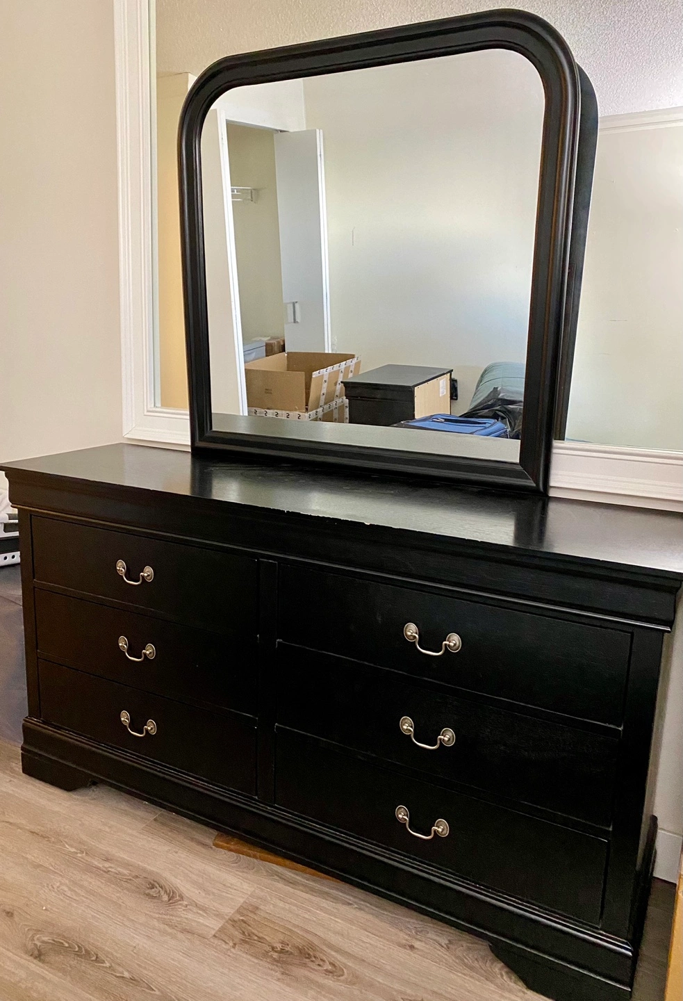 Black dresser with mirror. Six drawers. Mirror detaches and can be placed on top of dresser or independently. Condition is good with few small scratches. We’ll be moving out and these needs to be gone no later than Dec 10, 2024. Please note that you’re responsible to pickup the item and load in your car. Dresser Length.- 61” Depth- 17 3/4” Height- 33” Mirror - 38 x 38” Total height dresser & mirror - 71” Dressers Drawers Dimensions Length - 23” Depth -13” Height- 4” End table Dimension Length- 22” Depth - 5 3/4” Height- 24 1/4”