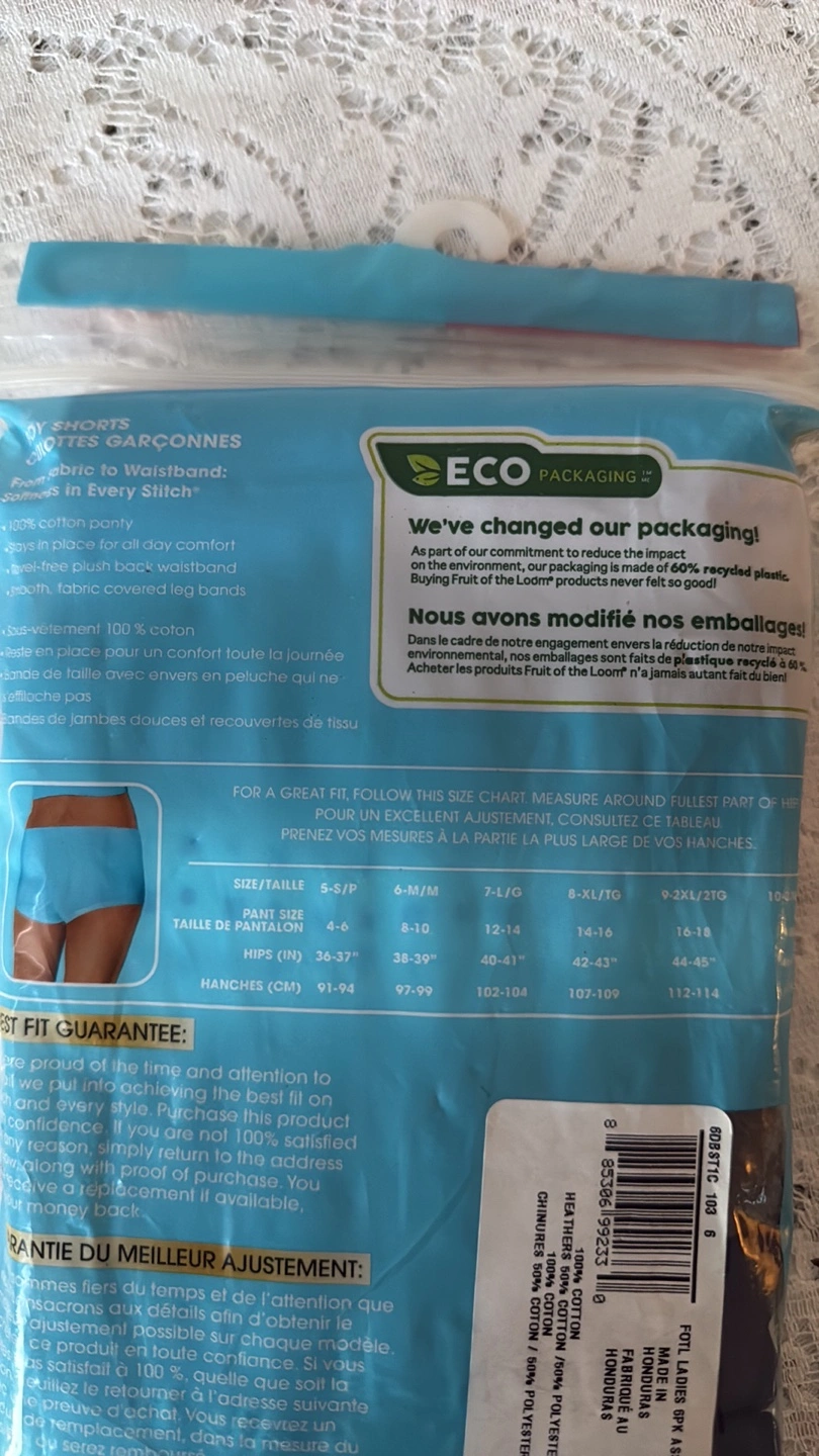 1000+MEETING LOCATION: Scarborough Town Centre Mall (Near Hwy. 401 & Mccowan) Any day during mall hours Fruit of the Loom Ladies Cotton Underwear Set (Boy Shorts style) From Fabric to Waistband: Softness in Every Stitch® 100% cotton panty • Stays in place for all day comfort • Ravel-free plush back waistband • Smooth, fabric covered leg bands • This pack includes six pairs of soft, breathable shorts perfect for all-day wear. **Condition:** New in packaging. Never opened since it's an incorrect size.