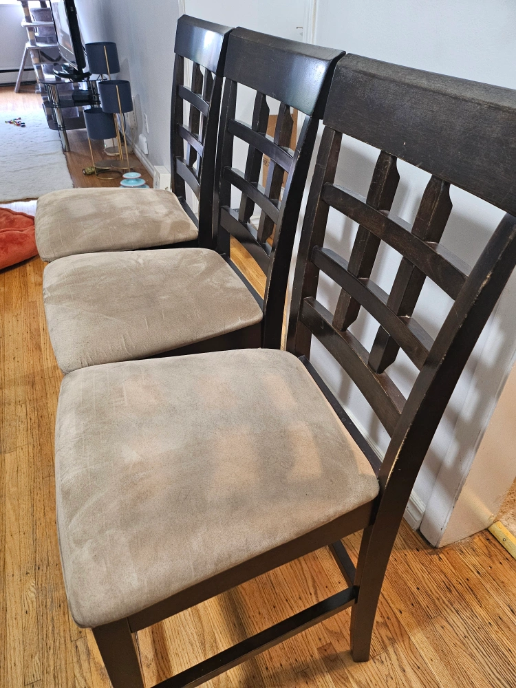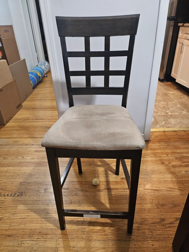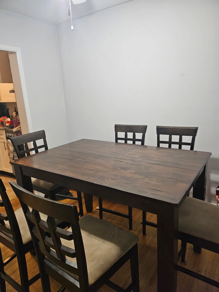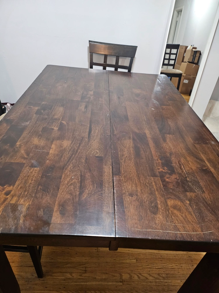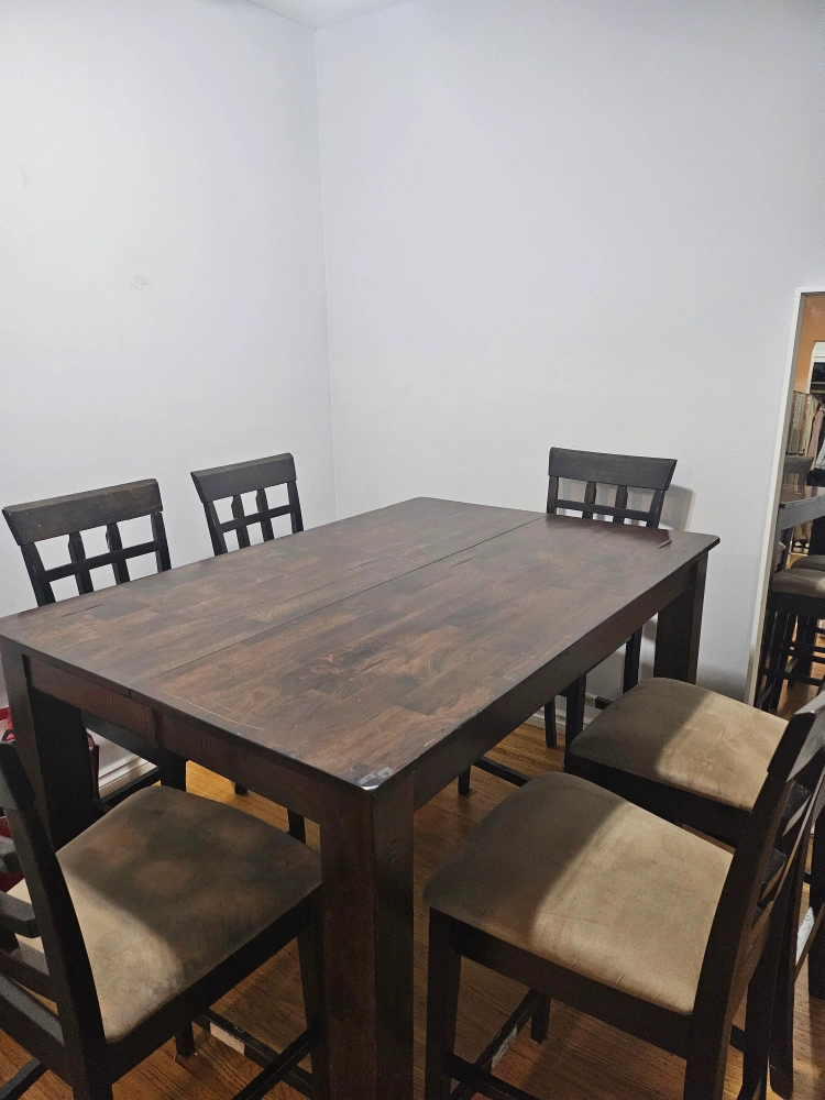 Dark brown wooden counter height extendable dining table with six coordinating chairs. Chairs feature a grid-patterned back and light beige fabric seats. Some minor wear and tear.