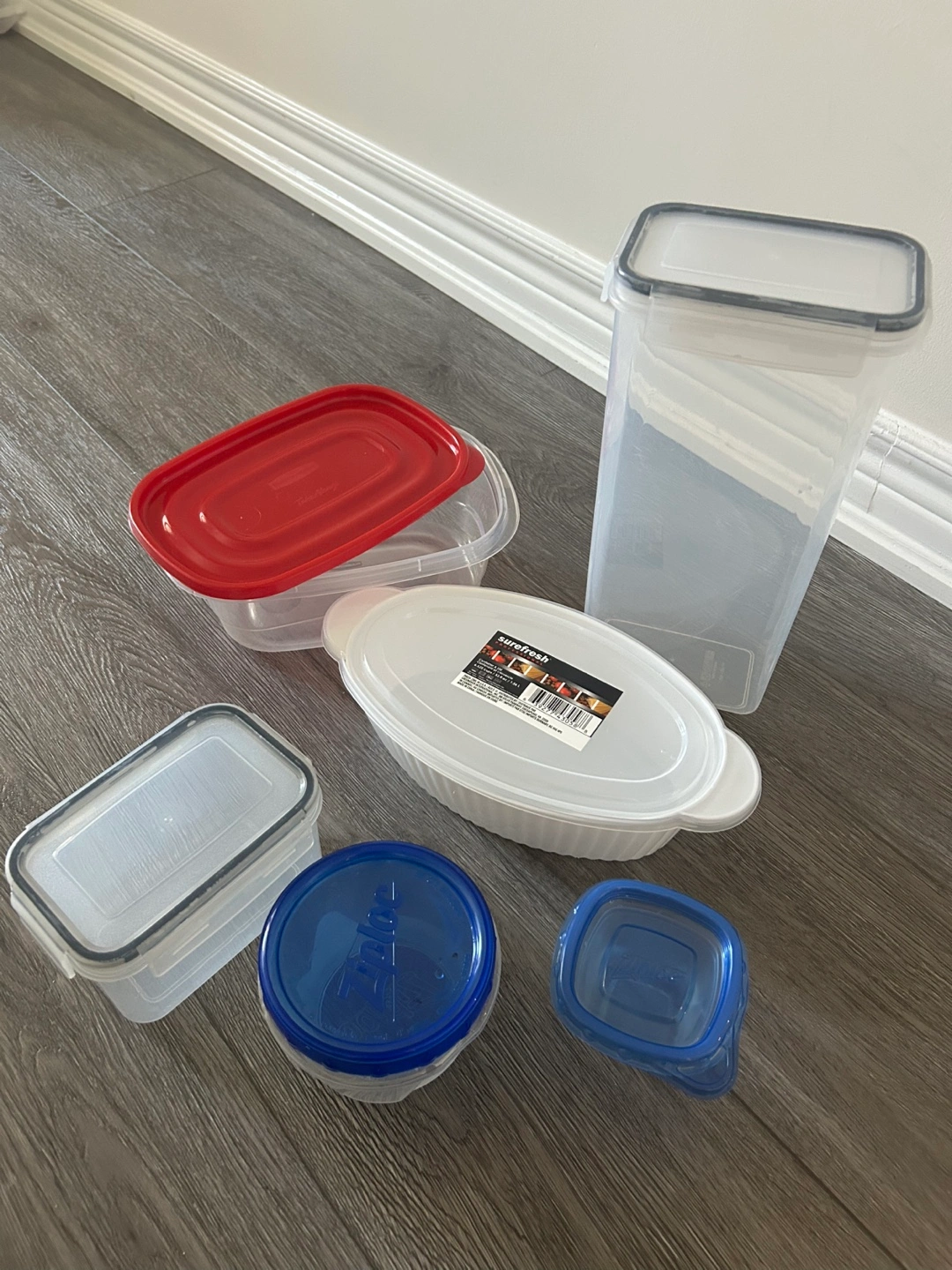 46Various sizes and shapes. Includes rectangular, oval, and square containers. Some lids are red, some are blue, and some are clear. Great for leftovers and meal prep.