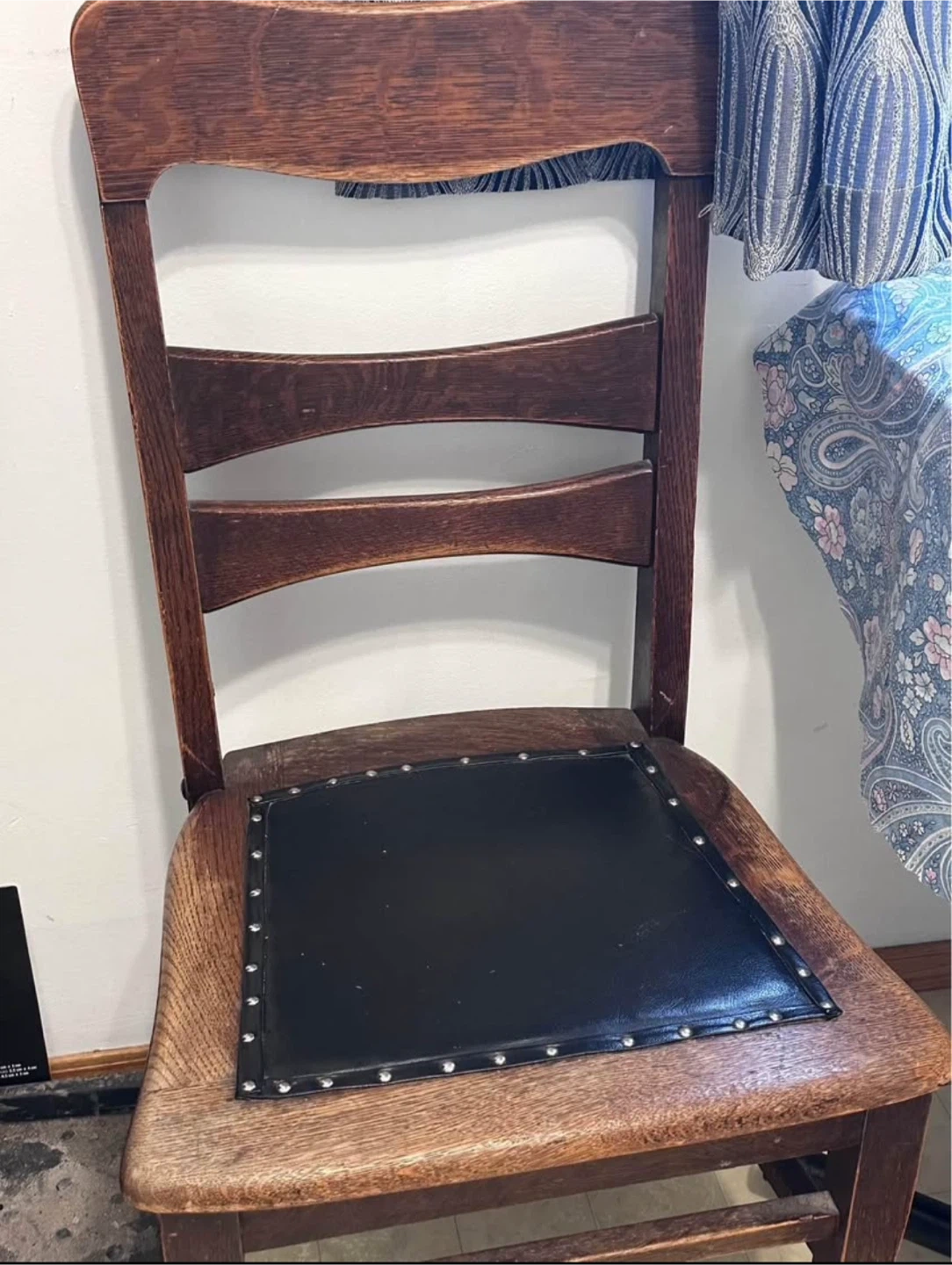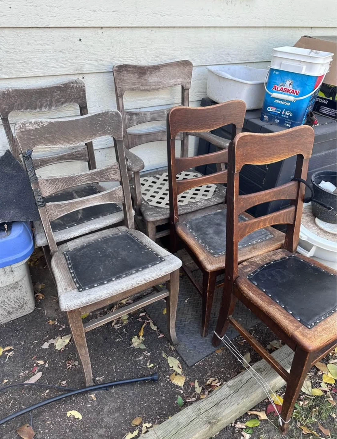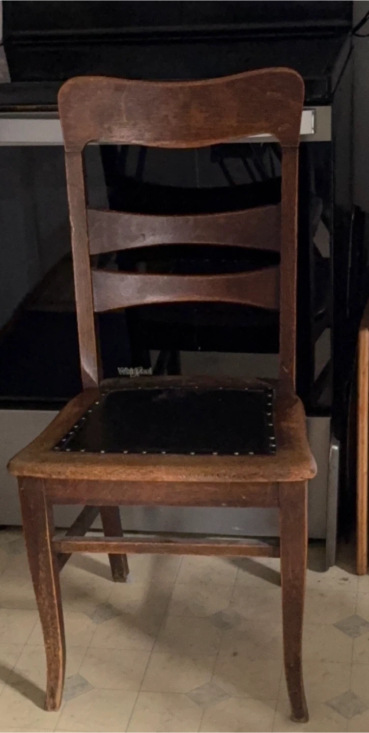 Selling 6 vintage wooden chairs with a black seat. They have a classic design and could be a great addition to your home. The chairs shows some signs of wear, three of the chairs were used as planters outside the other three were in the house, one of the chairs has arms, they need your tender, loving care.
