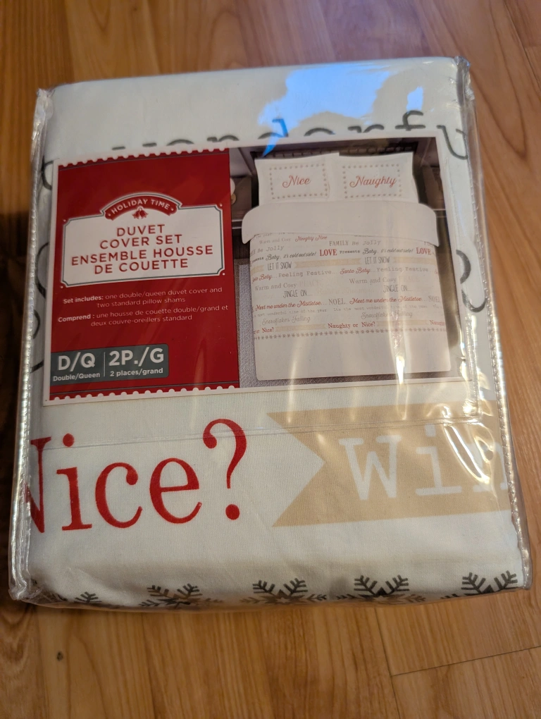 I'm selling a Holiday Time duvet cover set for a double/queen size bed! It includes one duvet cover and two standard pillow shams. The design is festive with a 'Nice?' and 'Naughty' theme. Perfect for the holidays!
