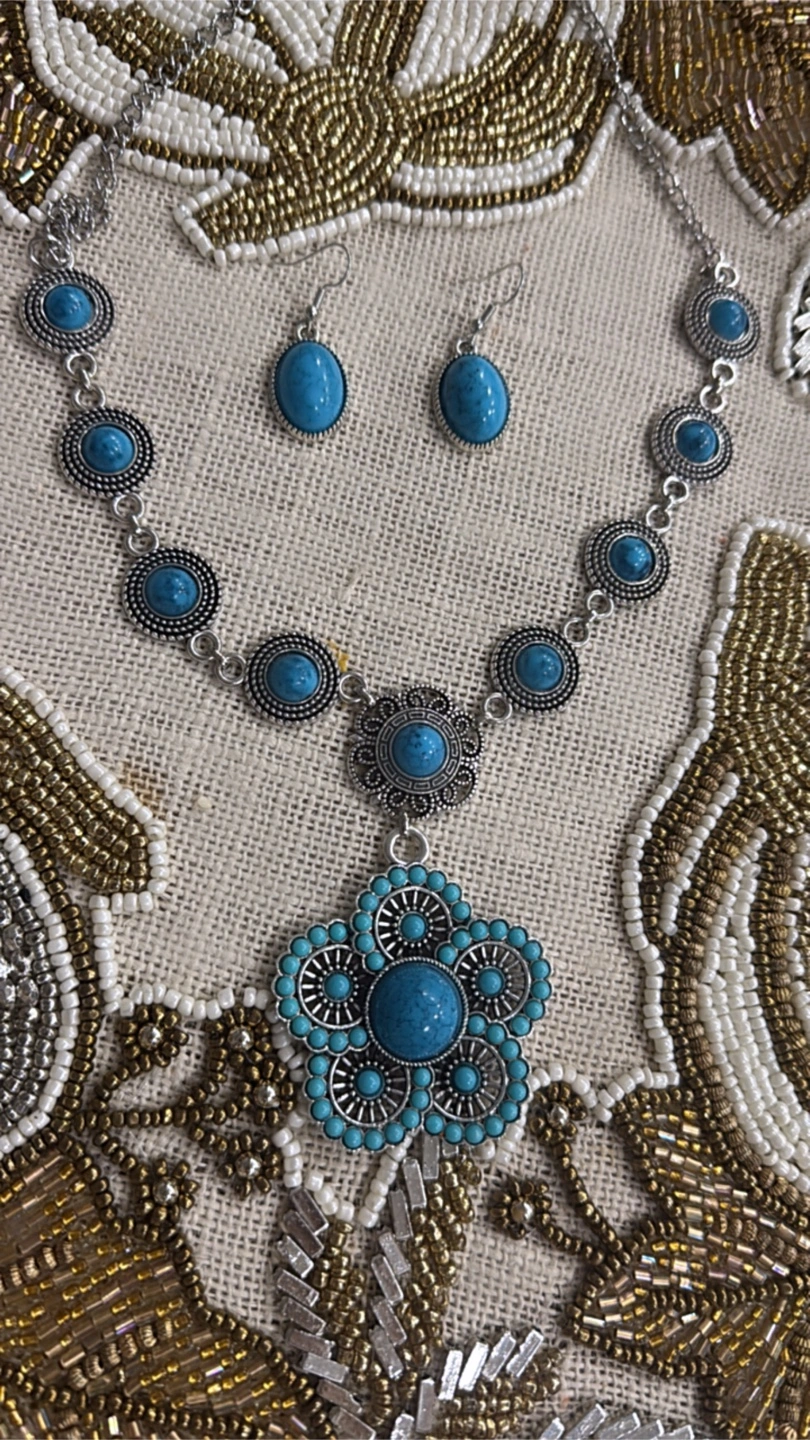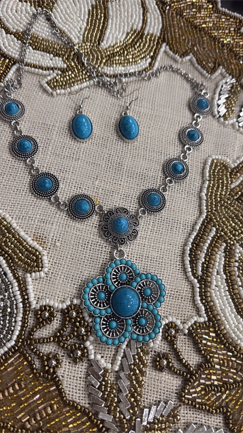 A lovely turquoise coloured necklace and earring set. Perfect for adding a pop of colour to any outfit!