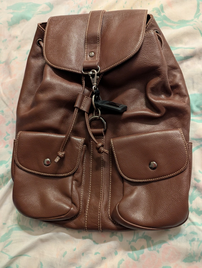 Here's a lovely brown leather backpack! It features a drawstring closure and a flap with a snap. There are also two front pockets with snap closures, perfect for keeping your essentials handy. The leather has a nice, rich texture.