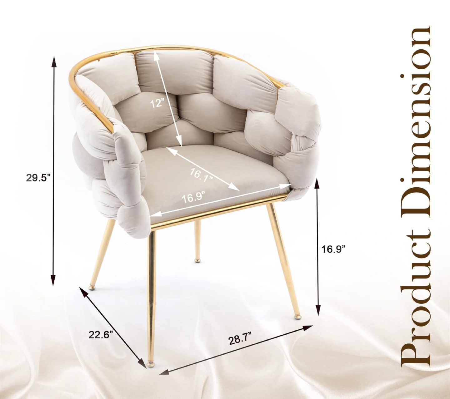 Selling a stylish accent chair with a hand-woven wrap-around back. It features a chic barrel back design with stacked lines for added character and comfort. The chair has gold-tone legs and a soft velvet seat. Dimensions are approximately 29.5" tall, 28.7" wide, and 22.6" deep.