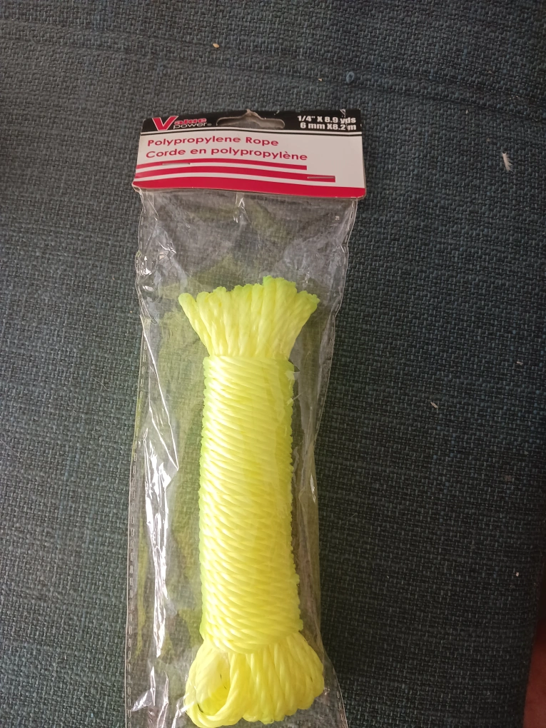 Selling a brand new package of Value Power Polypropylene Rope! The rope is bright yellow and is good for outdoor use, waterproof and hearty.