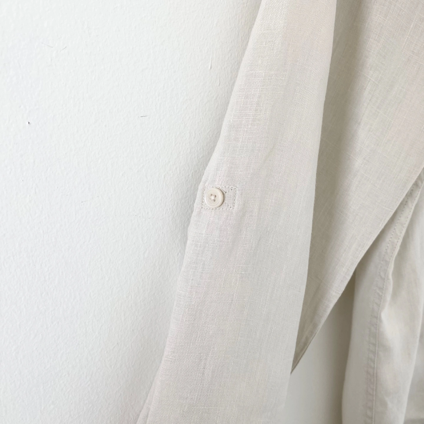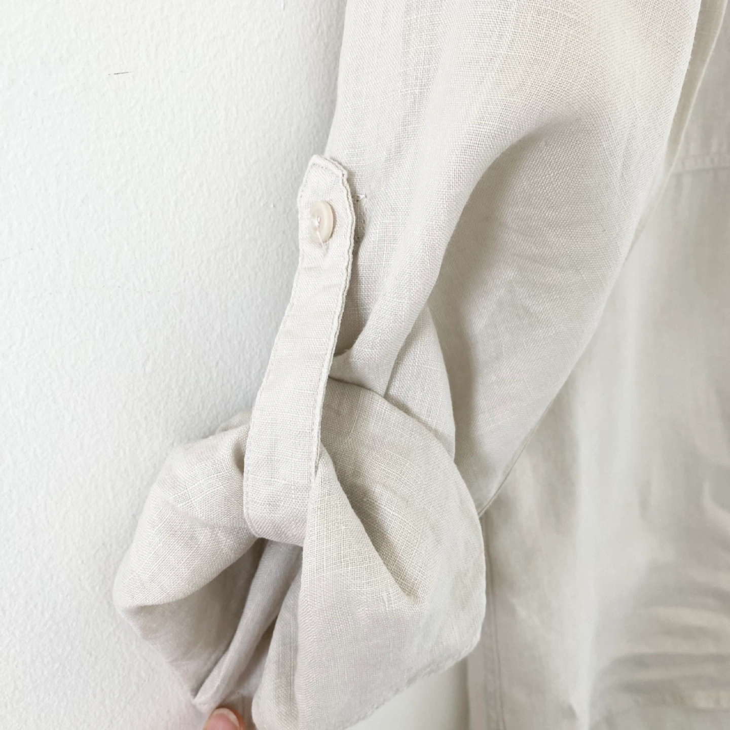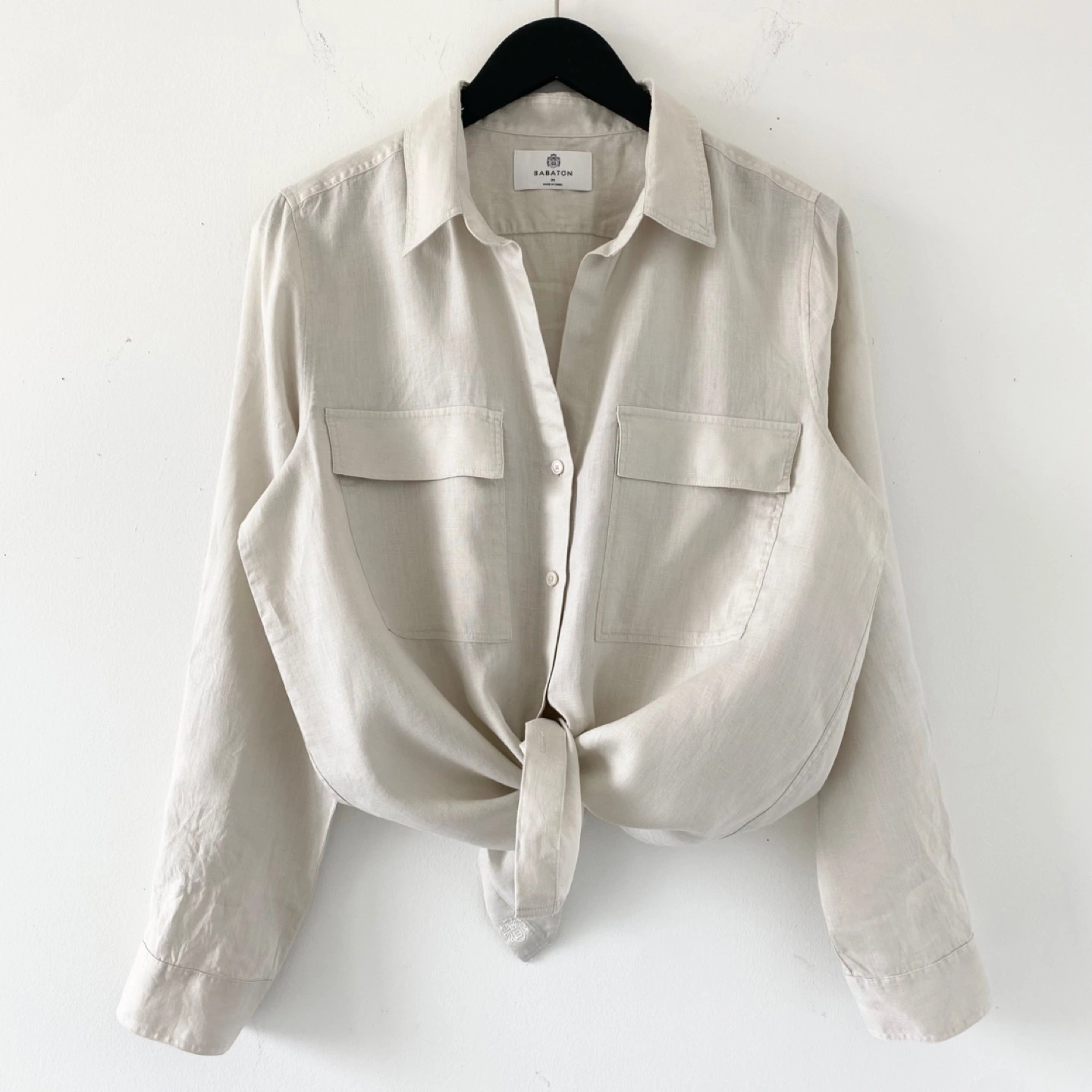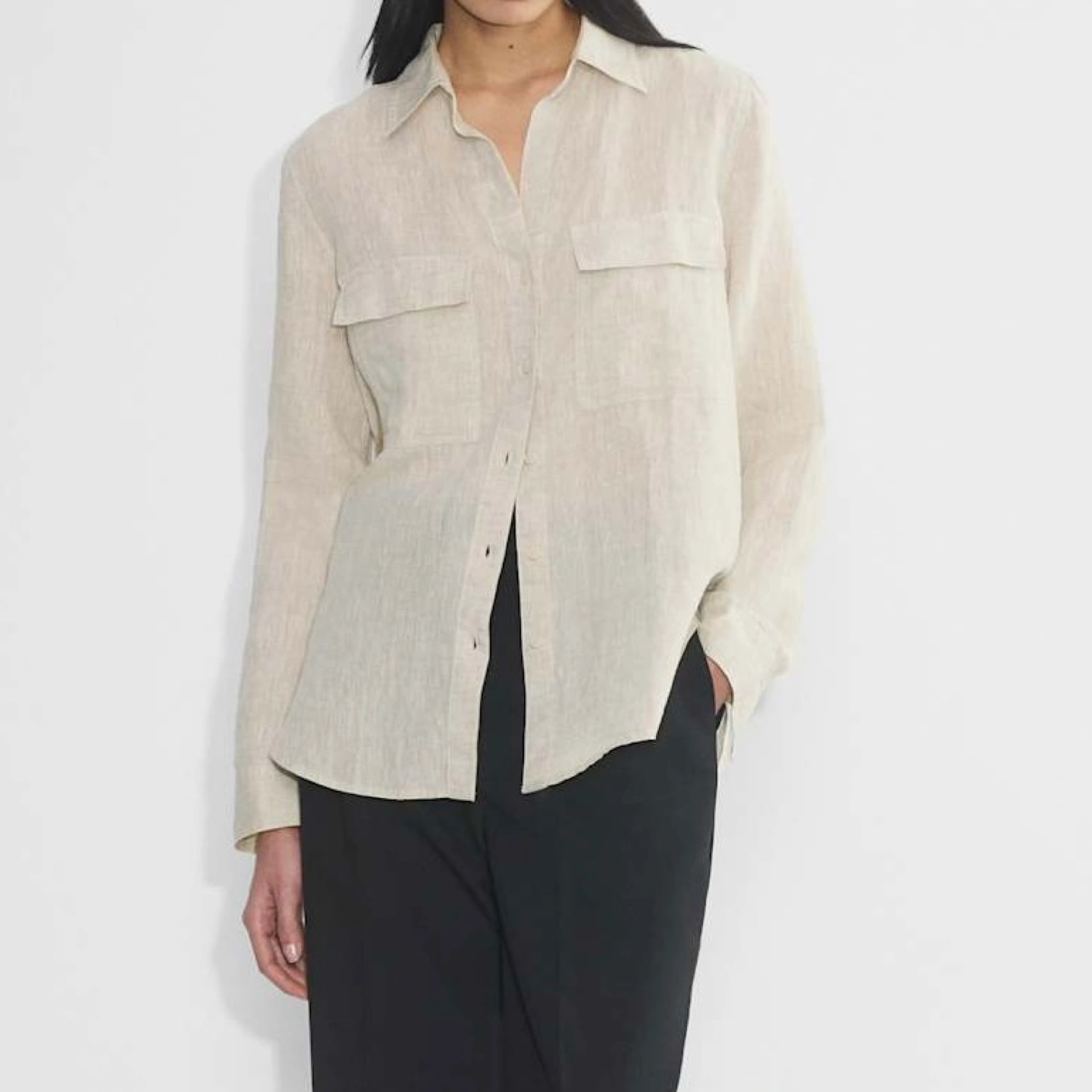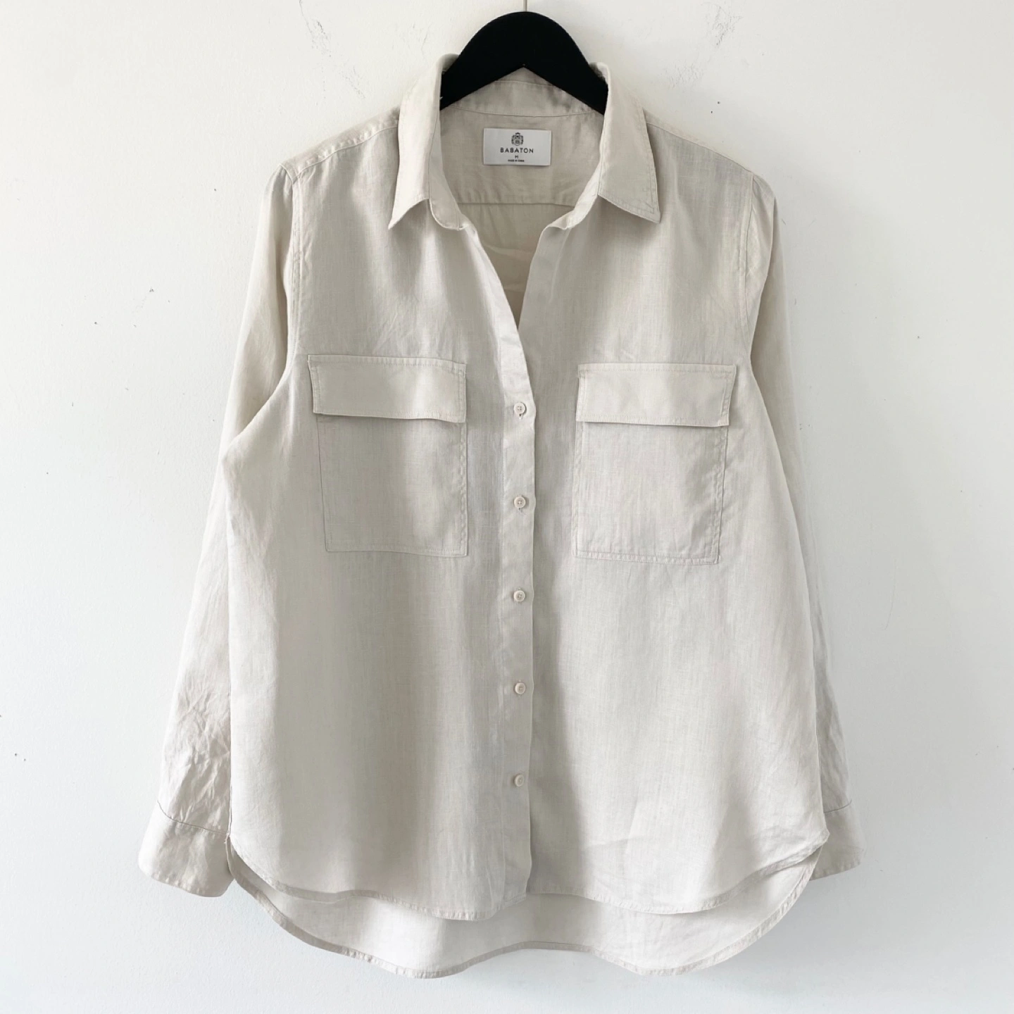 615Pick up only in Leslieville (Queen and Pape) Check out other listings! Aritzia Babaton utility shirt. Features a relaxed fit, flap patch pockets and tabs to keep sleeves rolled-up. It's made from lightweight 100% linen in a light grey-ish beige / light taupe colour. It's breezy, crisp and drapes beautifully. Can be styled many ways, from the city to the beach! There's no staining, snags or damage. It's clean and in excellent condition. *The last 2 pics are fit reference only. It's exactly the same style but the colour is slightly different. Size M Approximate measurements laid flat Shoulder 16.5” Pit to pit 22” Shoulder to cuff 24” Center back length 29.75”