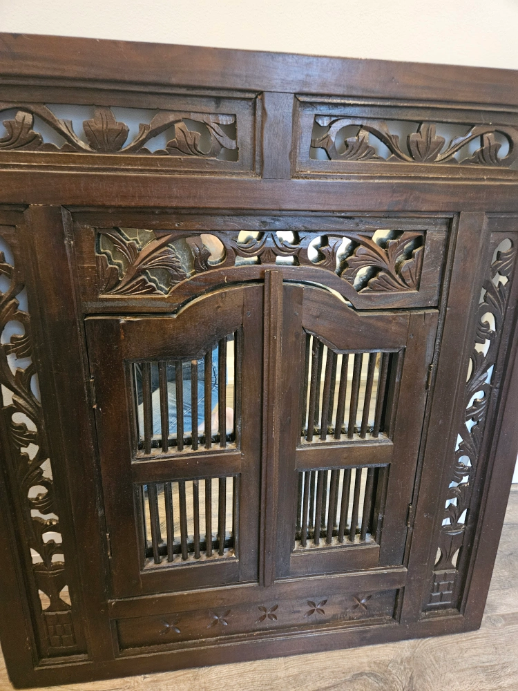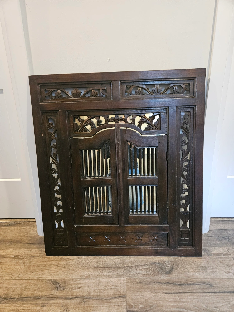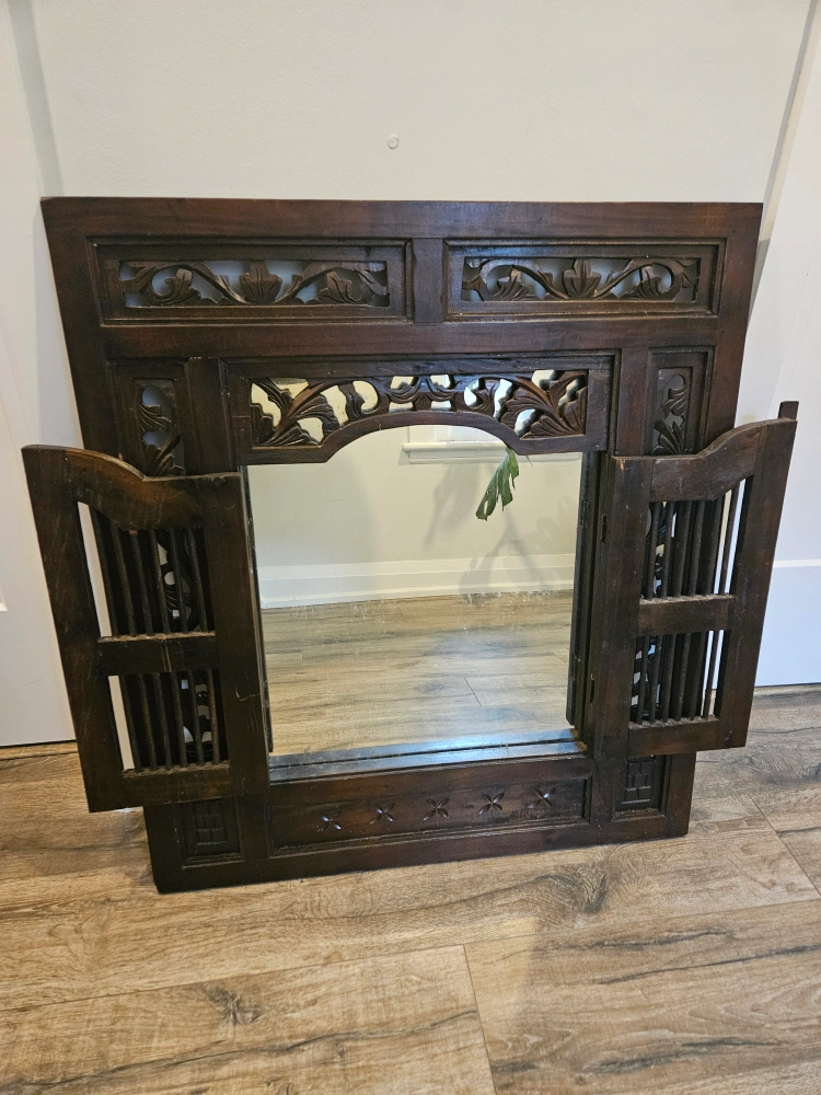 Beautiful carved wood window mirror! It's a unique piece that adds a touch of character to any room. The dark wood finish and intricate carvings make it a real eye-catcher