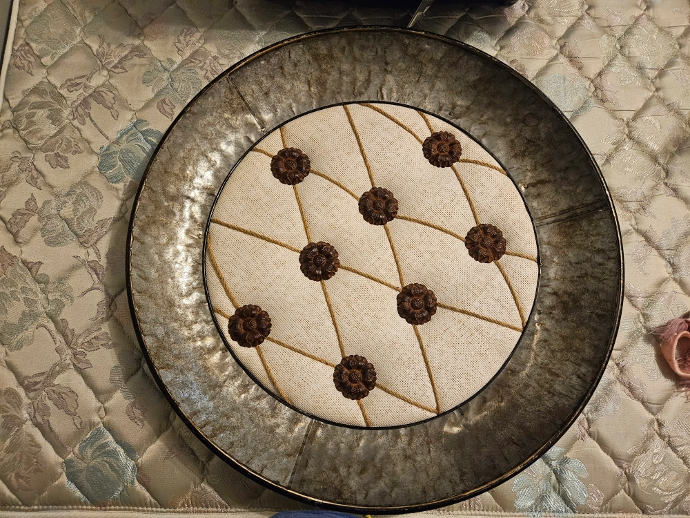 Selling a round wall hanging with a metal frame and fabric top. It has a rustic, industrial look with decorative button accents. 27 inch diameter.