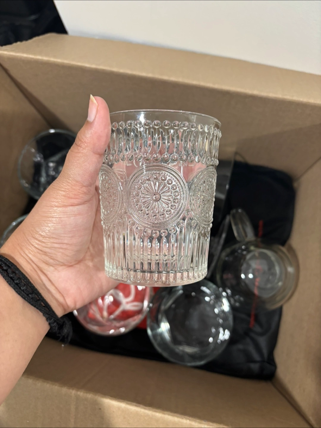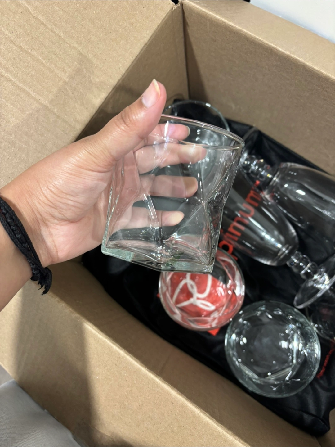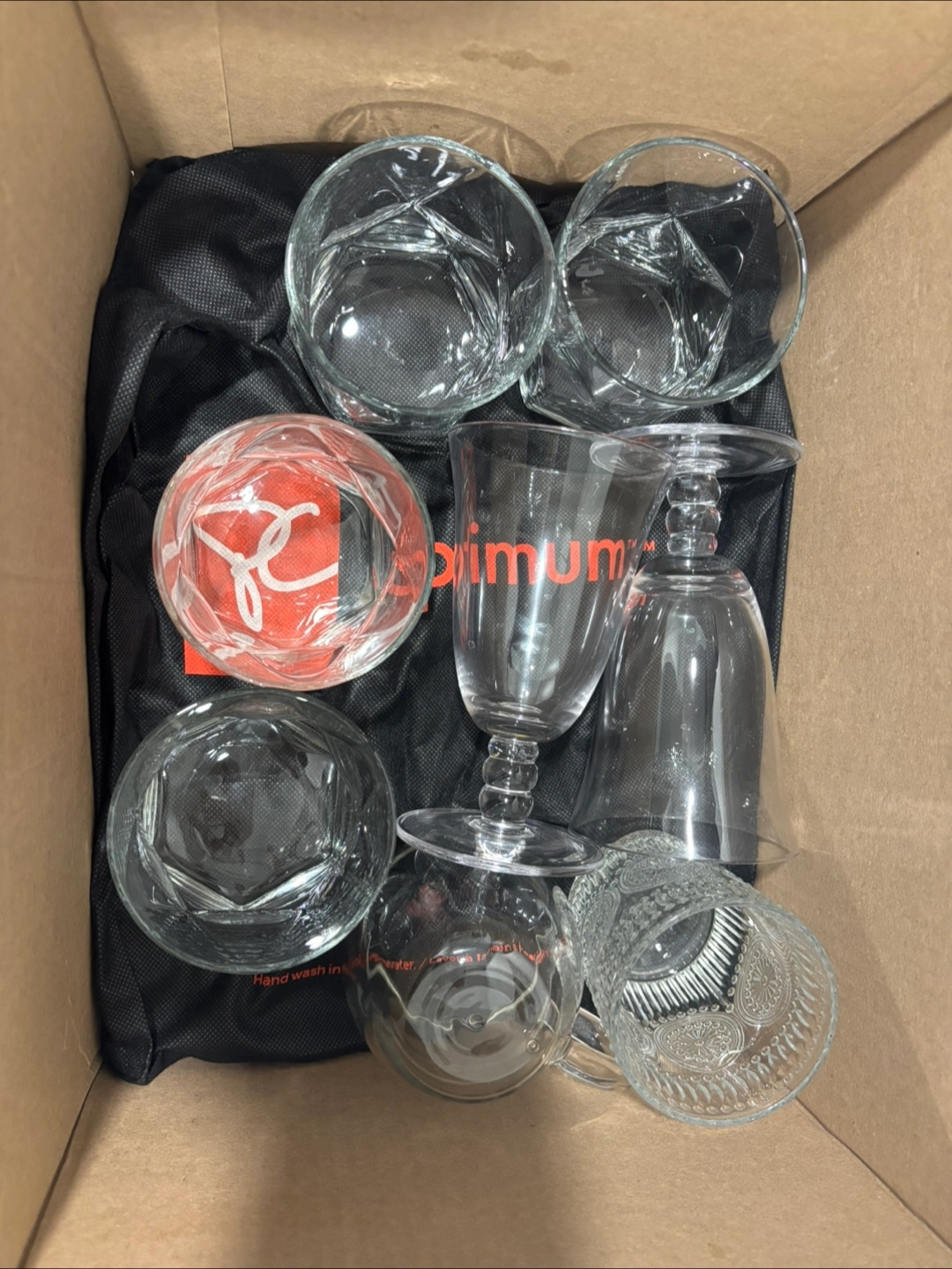 Selling a mixed set of glassware! There's a variety of styles included, perfect for different drinks or occasions. All the glasses are in great shape and ready for a new home. Comes in the box. 4 - water glasses - 2 wine glass - 1 glass with design- 1 double layered tea cup.(totals 8)