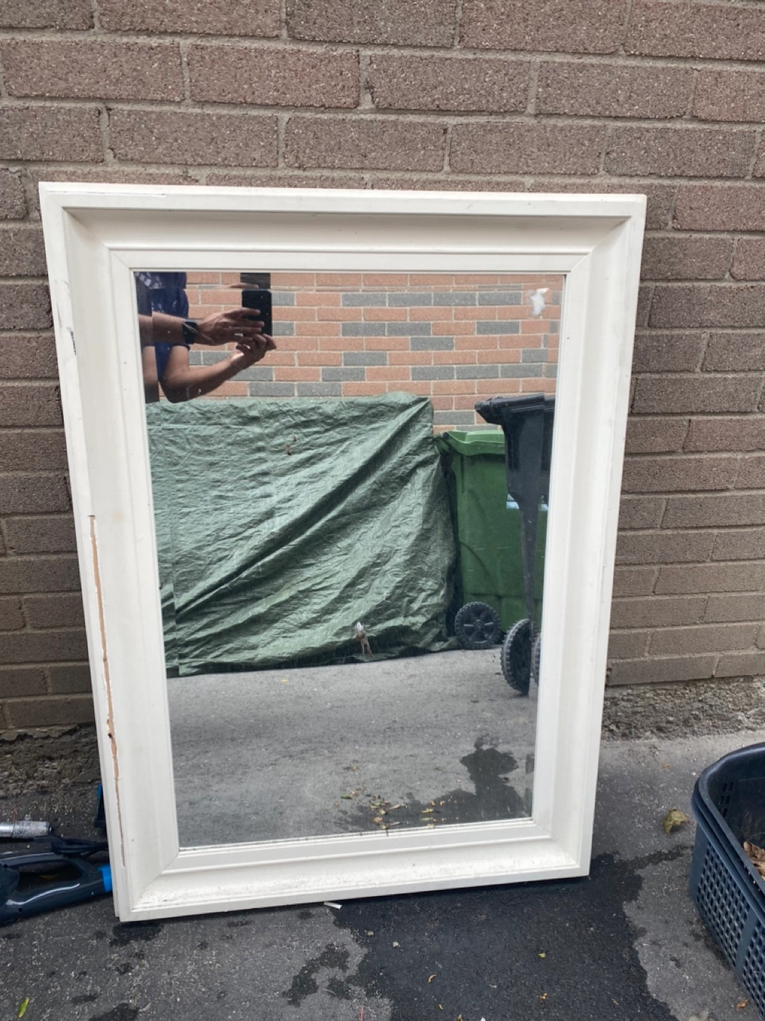 Selling a white framed mirror. There are some signs of wear and tear on the frame, as pictured. Nice project if you want to paint it. It would be great for any room!