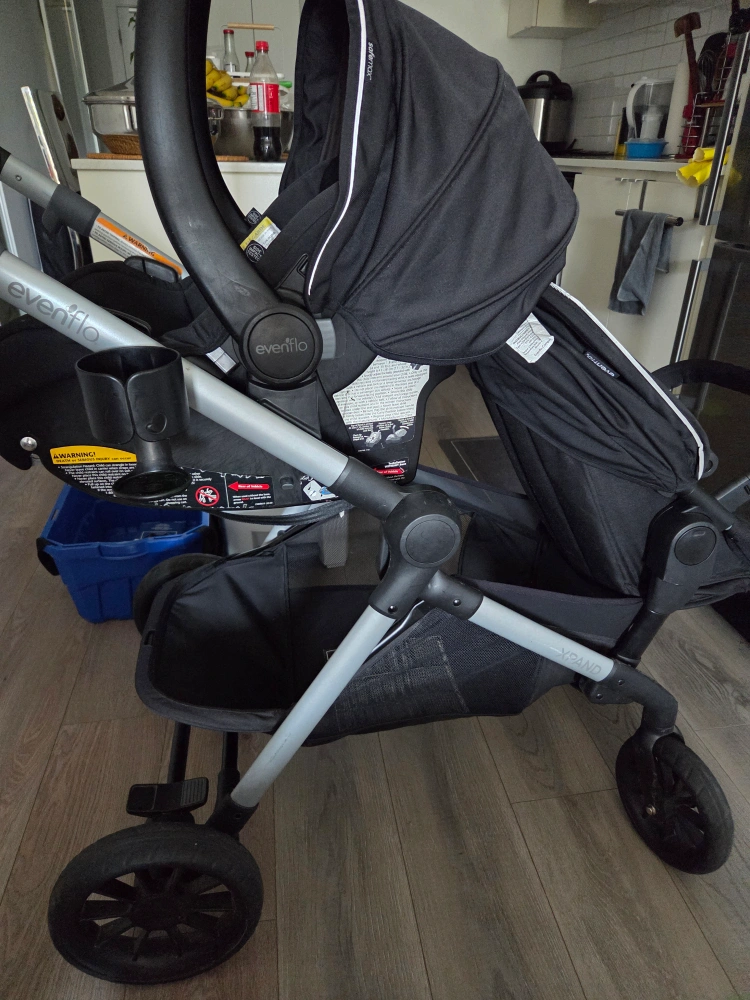 Selling an Evenflo Pivot Xpand Travel System in good condition. This system includes a stroller and infant car seat combo, making it super convenient for parents on the go! The stroller can convert to a double stroller as your family grows. It's a great choice for families looking for flexibility and ease of use