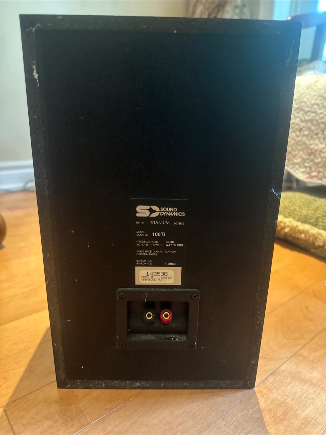 Selling a pair of Sound Dynamics 100Ti speakers. They are in good condition and ready to amplify your listening experience! the model is 100Ti, with an impedance of 4 ohms.