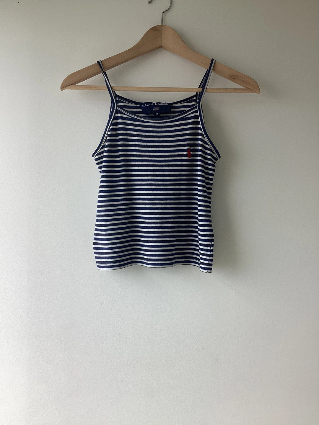 Classic Ralph Lauren striped tank top in size medium! It's in great condition and features the iconic Ralph Lauren logo. Perfect for summer days or layering under a cardigan.