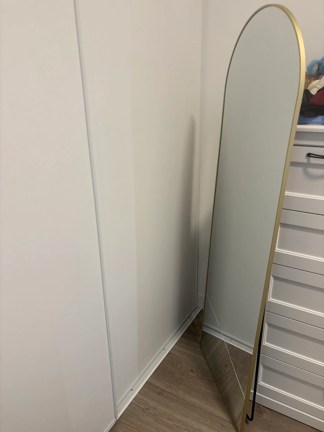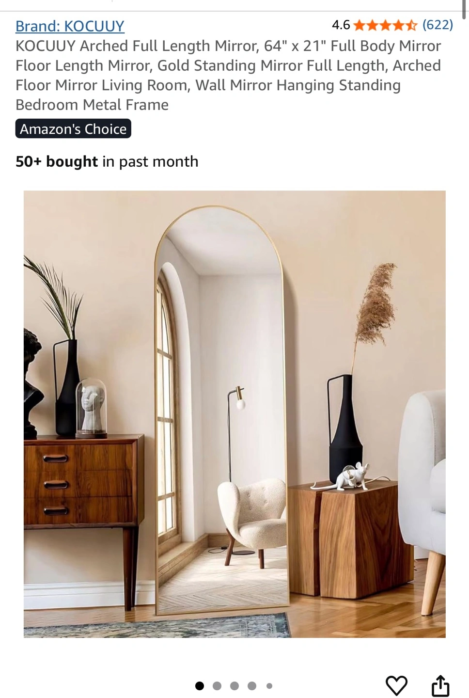 Selling a KOCUUY arched full-length mirror. It measures 64 inches by 21 inches. There is a crack on the mirror.
