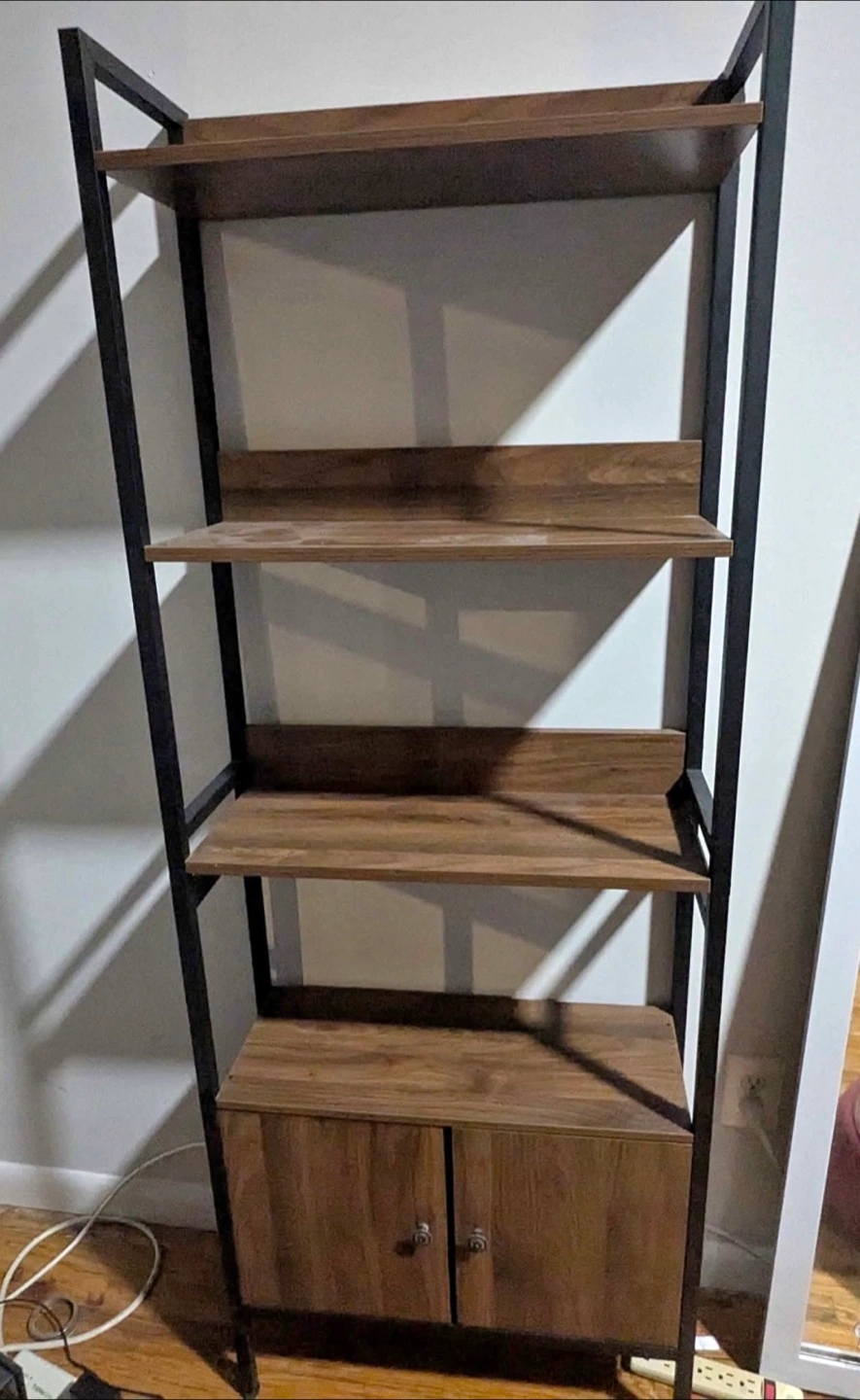 Selling a ladder shelf with a cabinet at the bottom for extra food. It's in great condition and ready for a new home! Perfect for adding storage and style to any room. Dimensions: 65” x 24”.