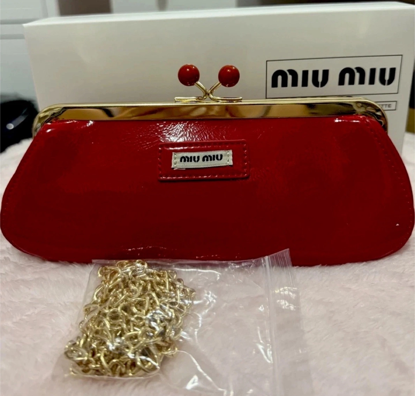 Selling a beautiful Miu Miu clutch! It's a vibrant red patent leather with a kiss-lock closure. Comes with a gold chain strap and the original box. Perfect for a night out!