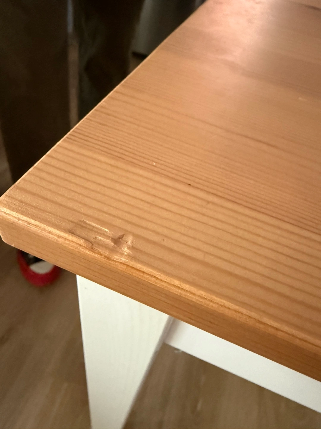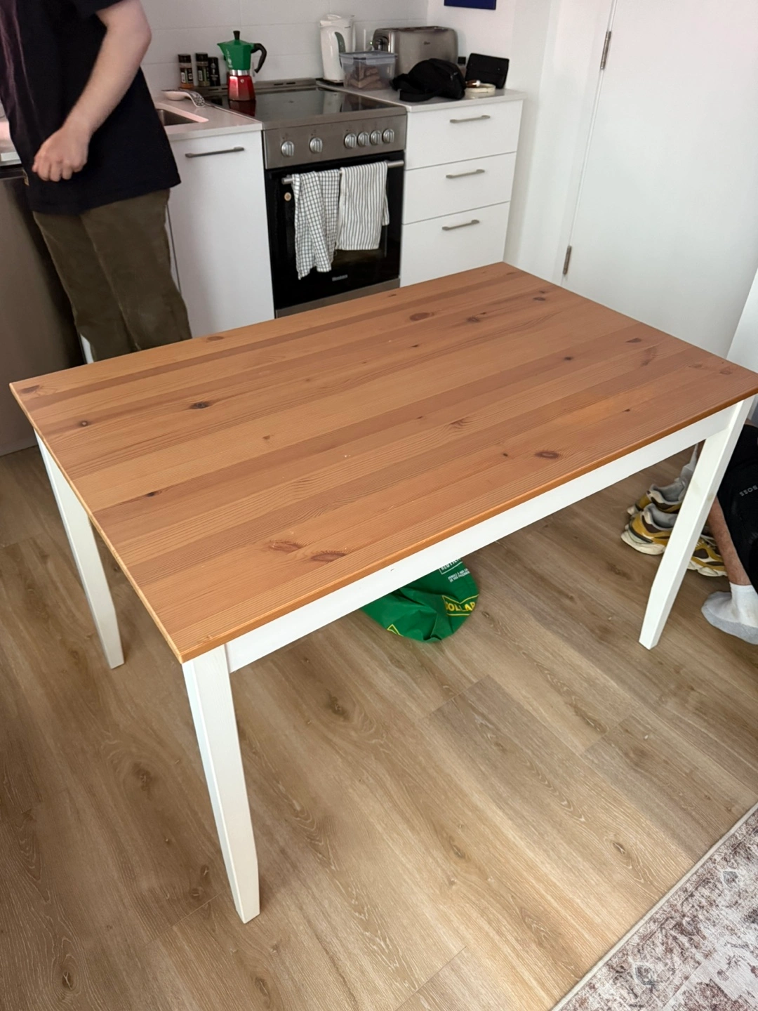 Selling a wooden dining table with white legs. It's in good condition with a few signs of use on the tabletop. Perfect for a small dining area or kitchen!