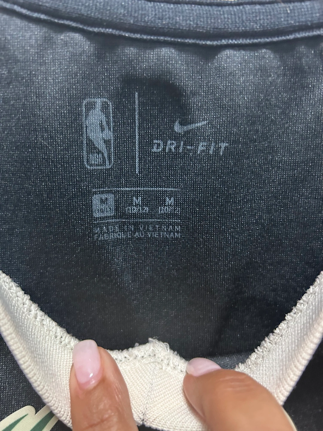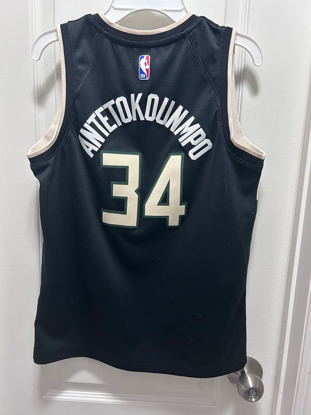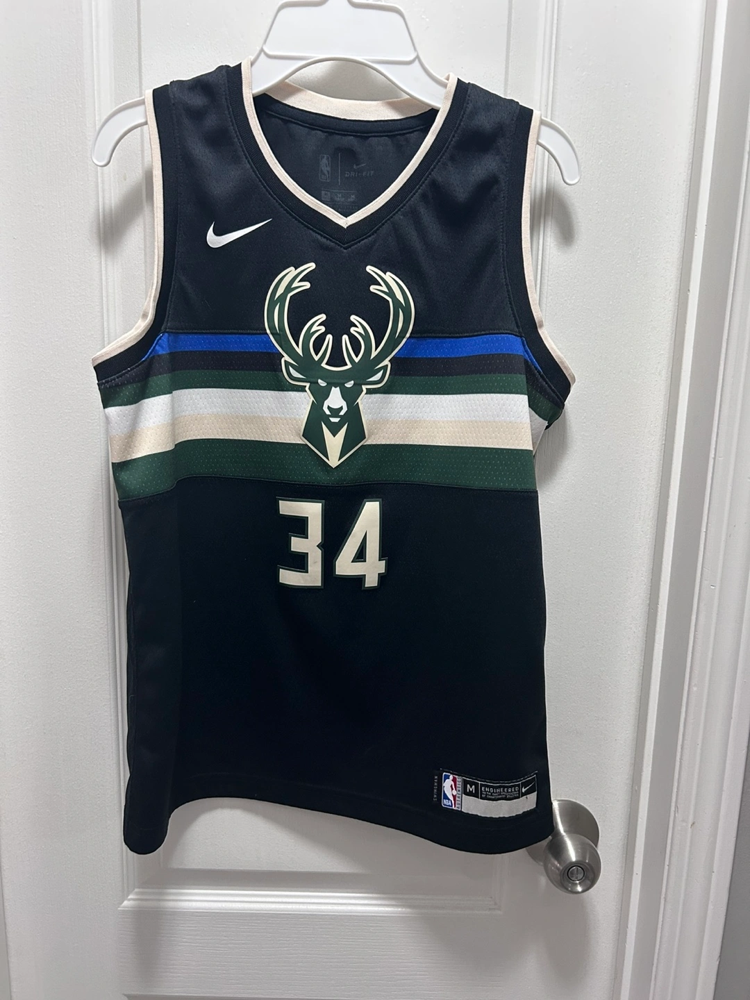 Selling a Nike NBA Milwaukee Bucks jersey in size M! It's in great condition and features the number 34 and the name ANTEKOTOUNMPO on the back. The jersey is black and has the NBA and Nike logos. It's made with DRI-FIT material, perfect for staying cool and comfortable!