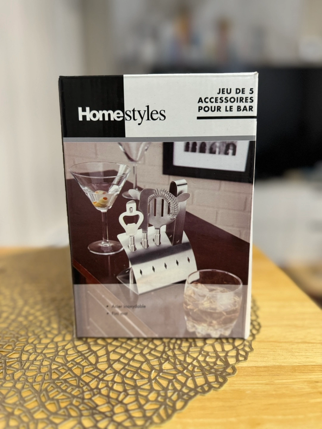 A brand new Homestyles 5-piece bar tool set! It's still in its original packaging and has never been used. The tools have a matte finish and are made of stainless steel. Perfect for setting up your home bar!