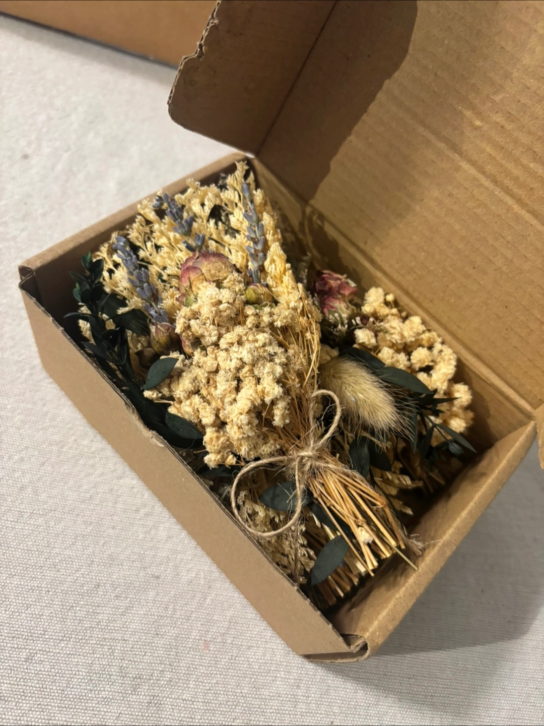 270Selling a lovely small dried flower bouquet. It comes in a box, The bouquet features a mix of dried flowers and foliage, tied together with twine. It would add a touch of rustic charm to any room or craft