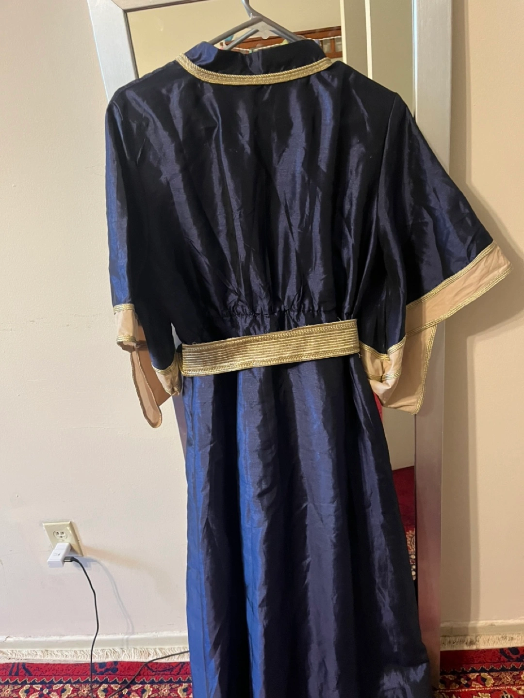 This is a lovely navy blue dress from Shine Wu. It features beautiful gold embellishments and a flattering belted waist. Perfect for a special occasion or a night out