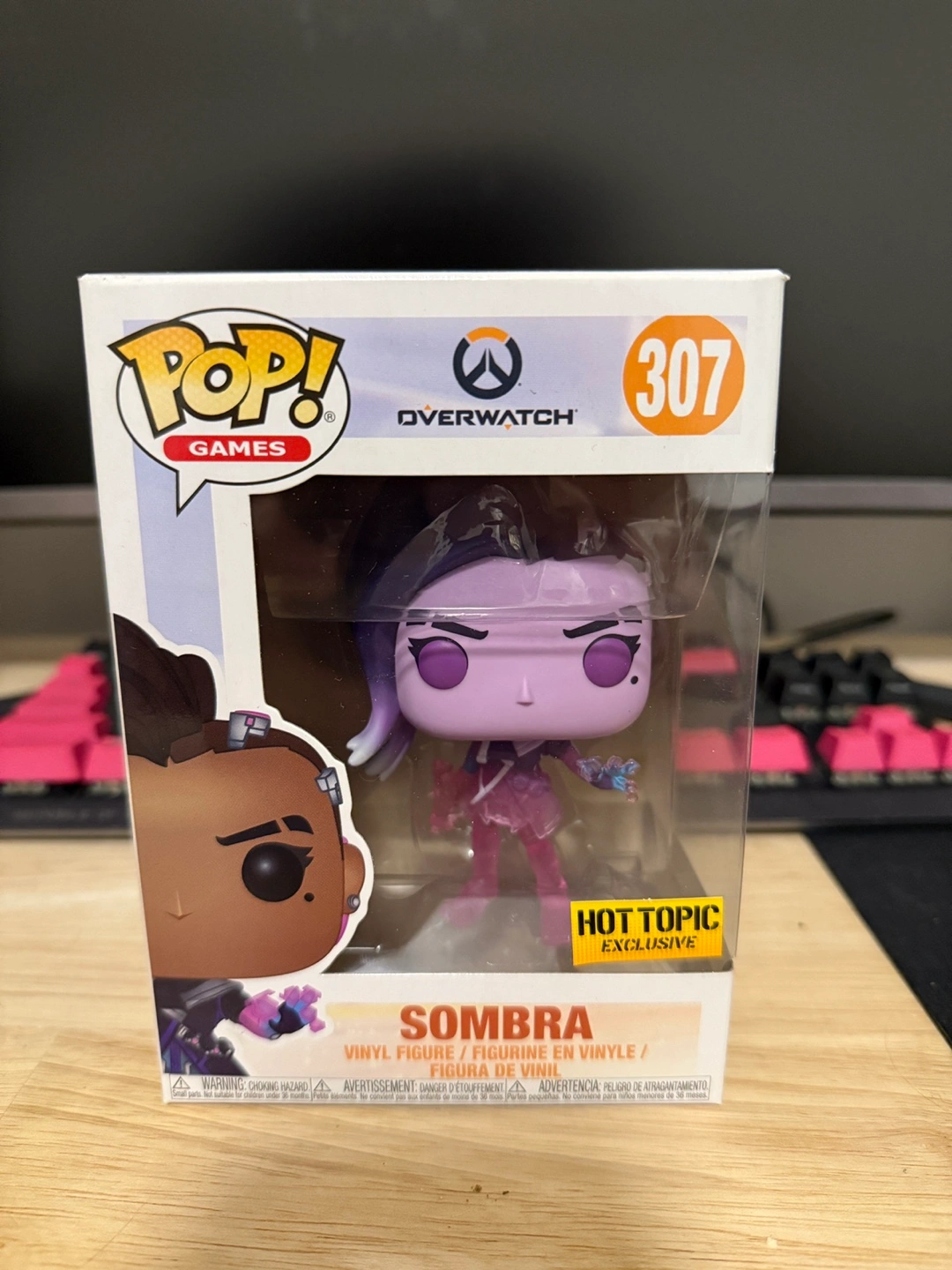 Selling a Funko Pop! figure of Sombra from Overwatch. This is number 307 in the series and a Hot Topic exclusive. It's a vinyl figure and comes in its original box!