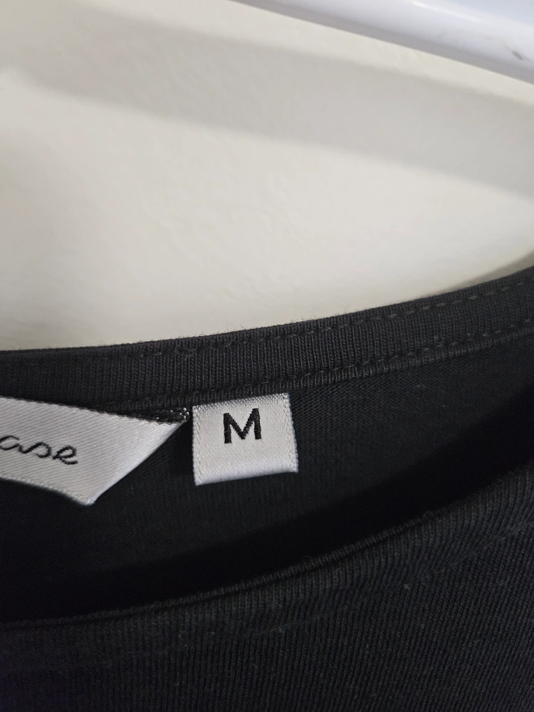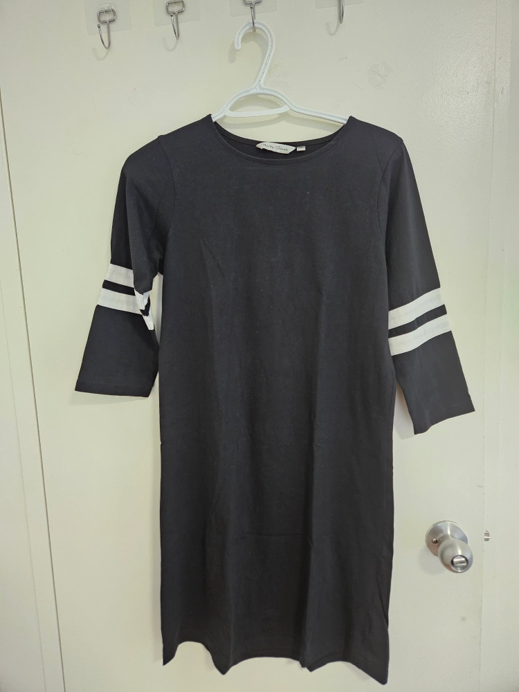 Selling a black dress with white stripes on sleeves.It's a size medium and features white stripes on the sleeves. Perfect for a casual look!