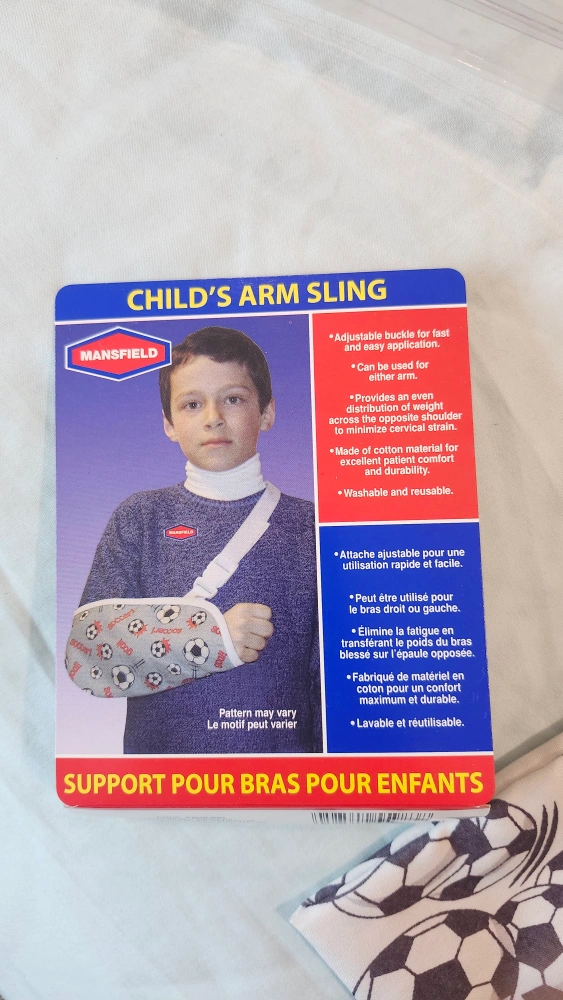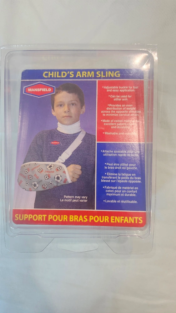 Selling a child's arm sling by Mansfield, featuring a fun soccer ball pattern! It has an adjustable buckle for easy application and can be used for either arm. It's made of cotton material for comfort and durability. It's also washable and reusable, which is super handy!