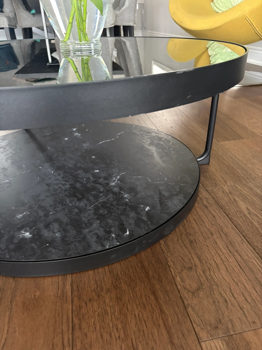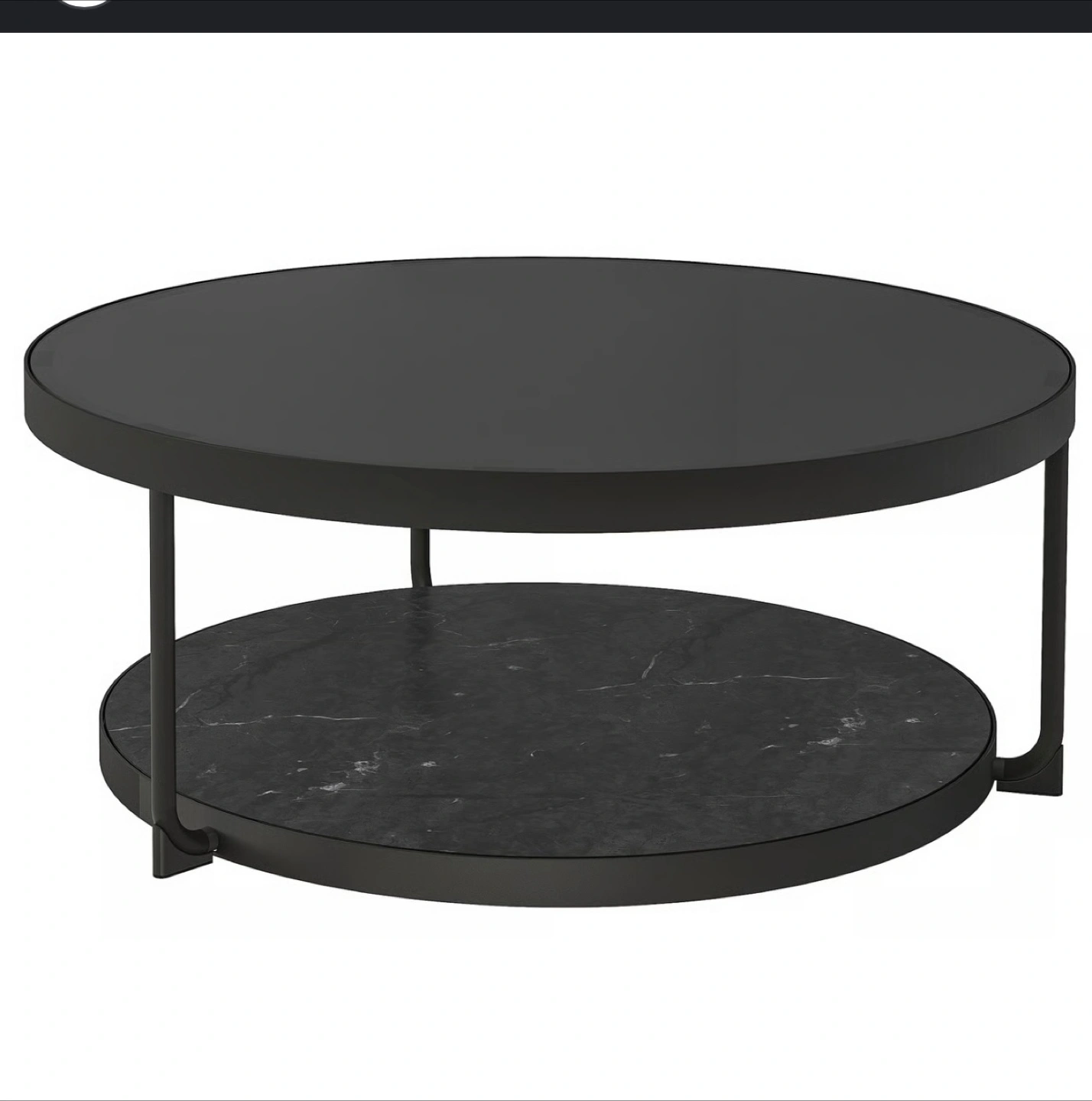 Selling a gently used IKEA coffee table. It's black and has a sleek, modern look. The table features a round top and a lower shelf, perfect for storage or display. Dimensions are approximately 88cm (34 5/8") in diameter and 35cm (13 3/4") in height.