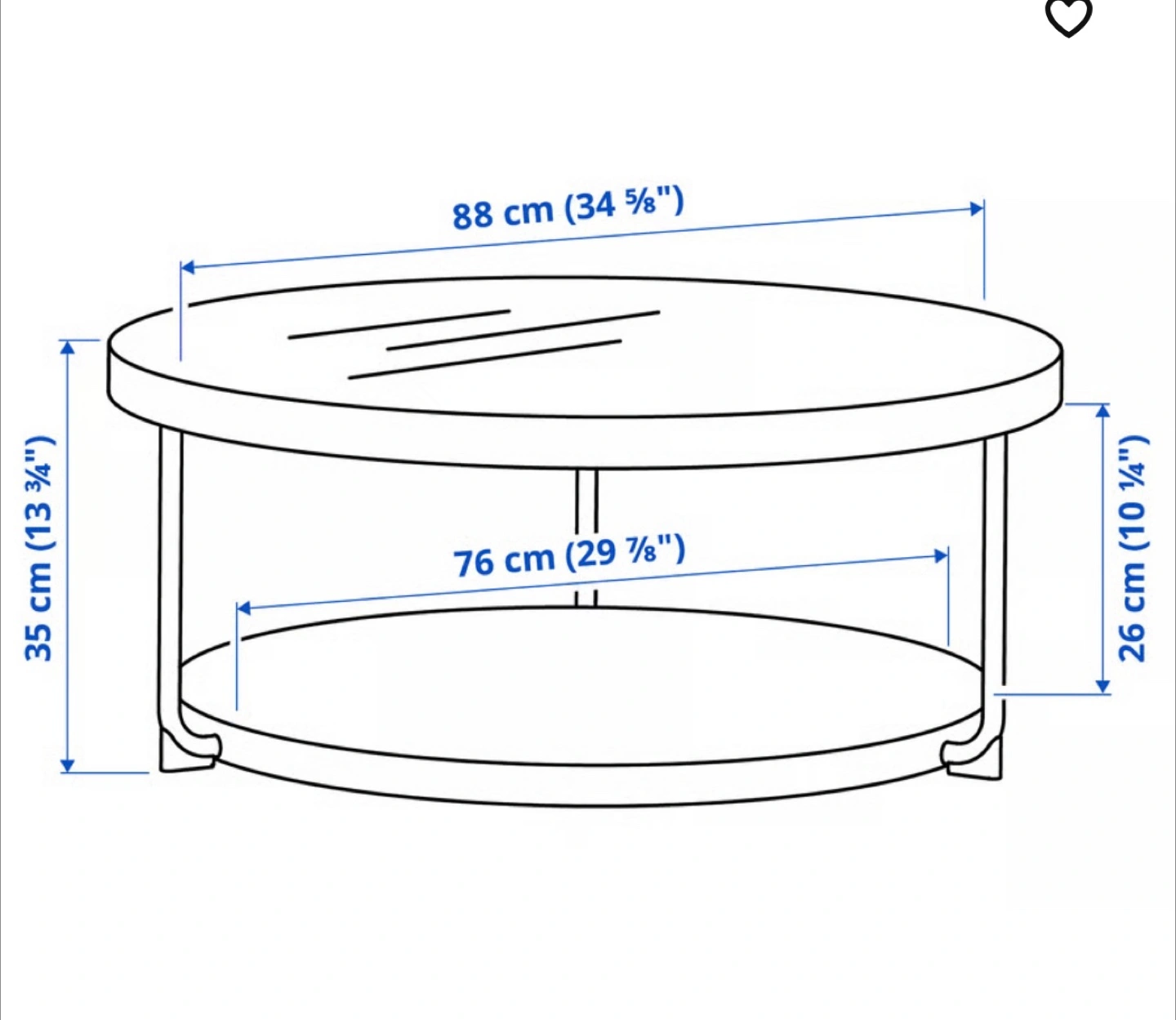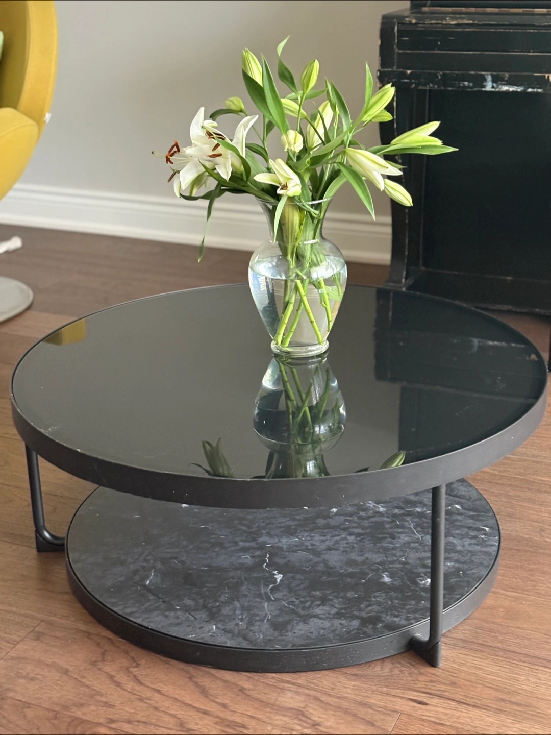 Selling a gently used IKEA coffee table. It's black and has a sleek, modern look. The table features a round top and a lower shelf, perfect for storage or display. Dimensions are approximately 88cm (34 5/8") in diameter and 35cm (13 3/4") in height.