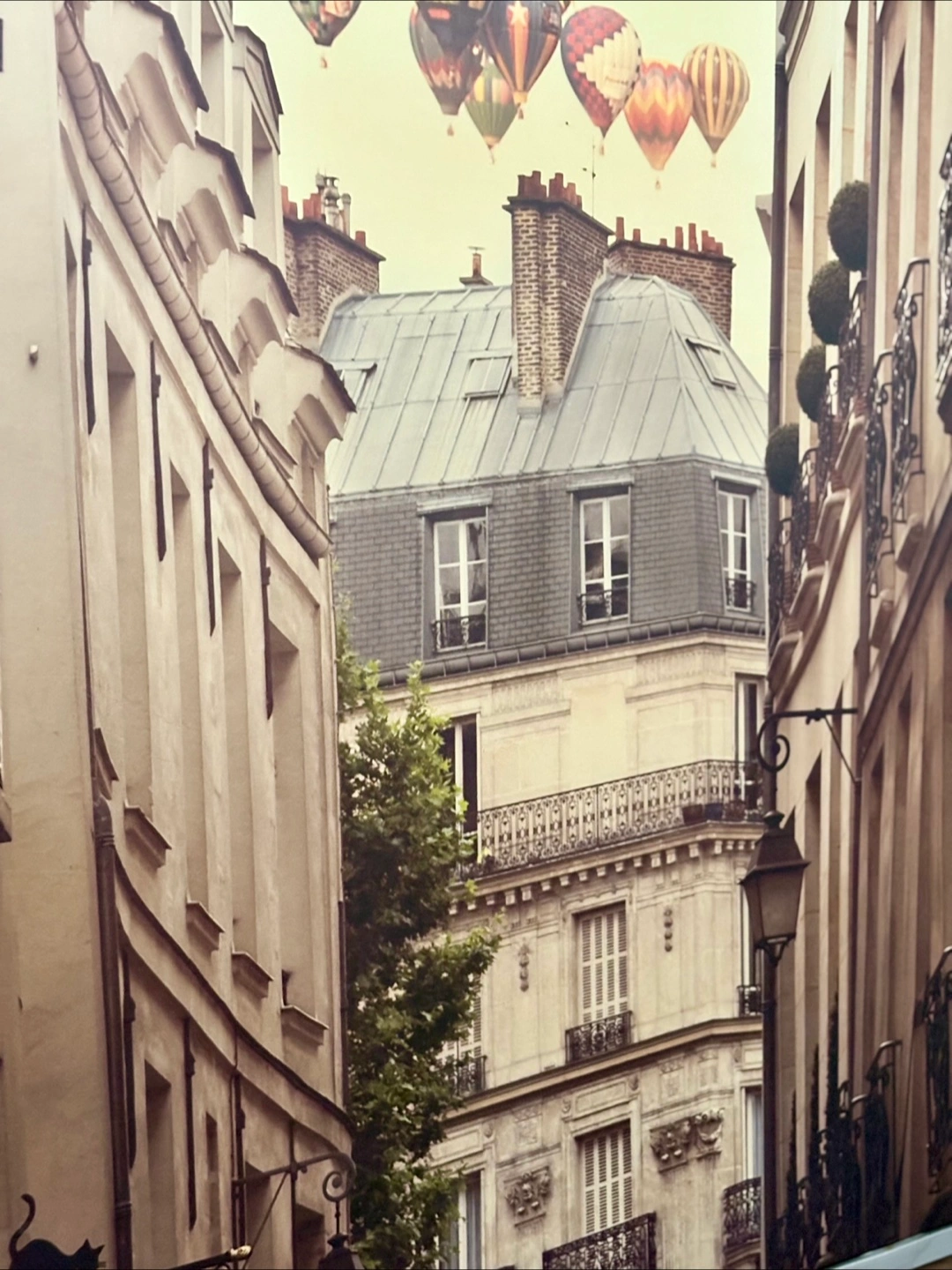 Selling a framed print featuring a charming Parisian street scene with hot air balloons. The frame has a silver finish and the print measures approximately 95cm wide and 1.31m tall. There is some minor wear on the frame, as shown in the photos.