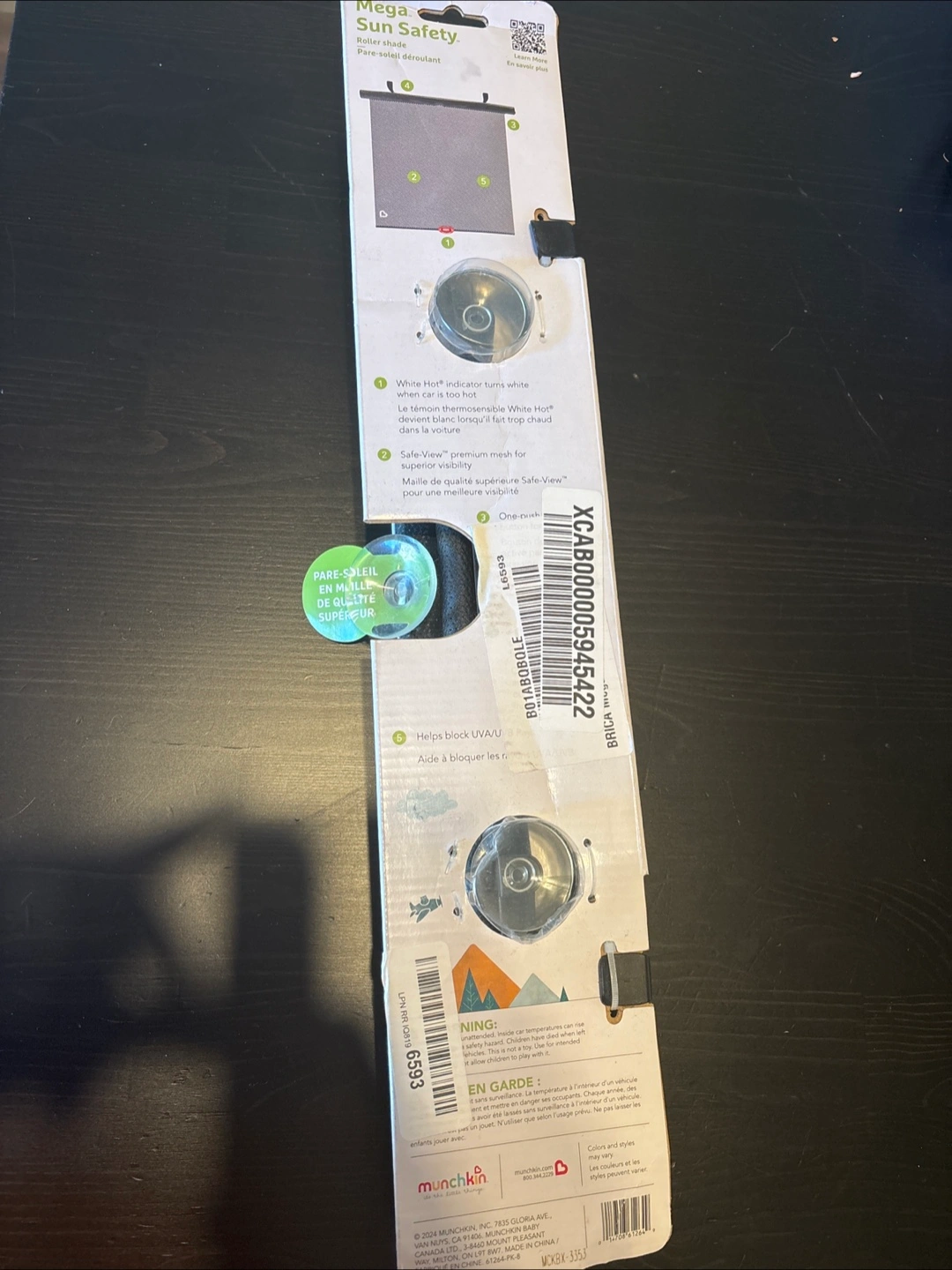 I'm selling a brand new Munchkin Mega Sun Safety Roller Shade! It's designed to help block UVA/UVB rays and features a White Hot indicator that turns white when the car is too hot. It's an extra-wide shade suitable for SUVs and mini-vans.