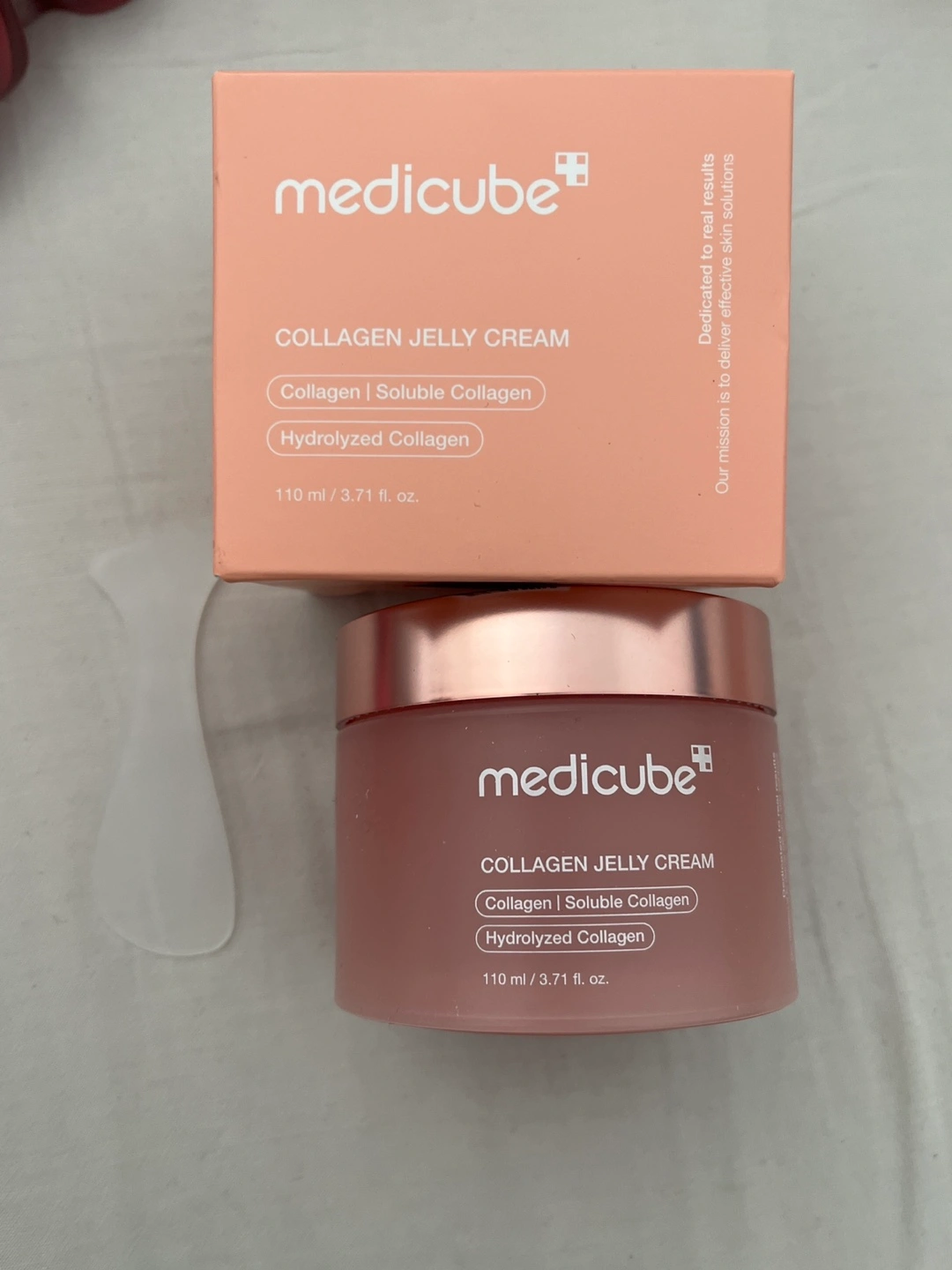 I'm selling a Medicube Collagen Jelly Cream. It contains soluble and hydrolyzed collagen. The size is 110 ml / 3.71 fl oz. Also selling the medicube booster pro (in pink) for $250