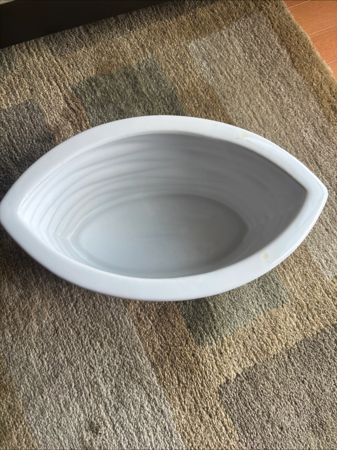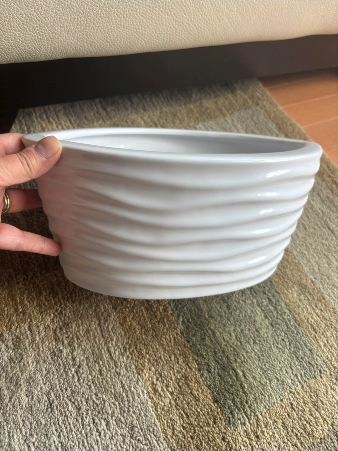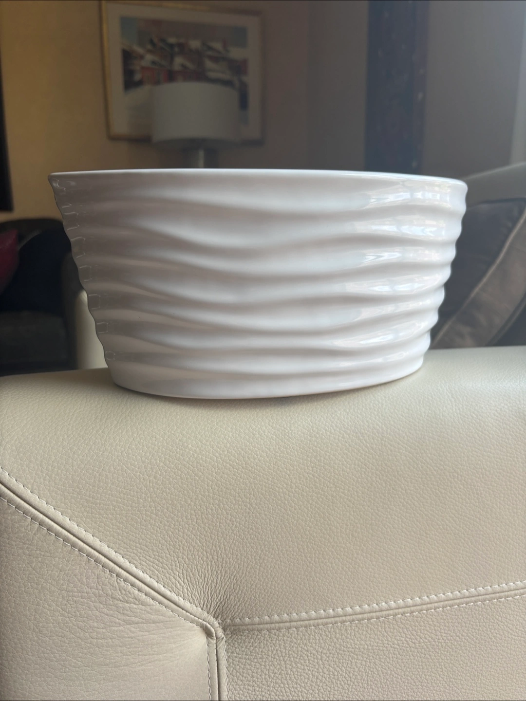 979Selling a lovely white ceramic bowl with a unique wavy design. It's in great condition and would look beautiful as a centrepiece or decorative accent in any room. It's perfect for adding a touch of elegance to your home decor! It was previously used for a big orchid arrangement. It measures 5 inches tall, 11 inches length from edge to edge and about 7 inches wide. The rim has 6/8 inches width. From a PF and SF home. Pickup only in the St Lawrence market area of downtown Toronto. Cash only.