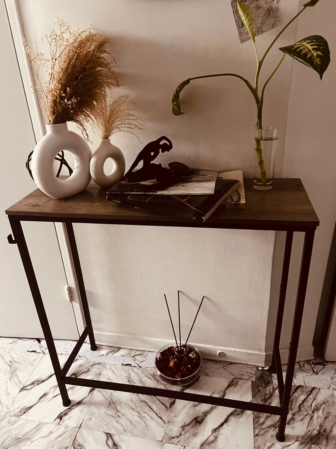 Selling a console or hall table with a wood top and metal frame. It's in great shape and would look lovely in an entryway or hallway. The dimensions are approximately 31.5 inches wide, 11.81 inches deep, and 31.7 inches tall. It can support up to 70 lbs
